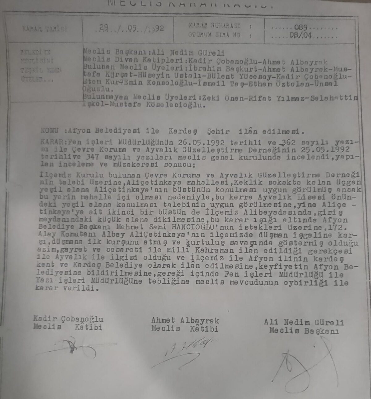 Afyon Belediye Başkanı M. Sami Hancıoğlu isteği üzerine Ayvalık sivil toplum kuruluşları ve Ayvalık Belediyesi, Ali Çetinkaya ile ilgili talepleri kabul ediyor. Afyon Belediyesinin gösterdiği ilgi ve kültürel desteklerden dolayı Ayvalık Belediye Meclisi, 29 Mayıs 1992 tarihli oturumunda 089 numaralı resmî kararıyla Ayvalık ilçesi ve belediyesinin Afyon Belediyesi ile Kardeş Kent ve Belediye olmasının ilan edilmesi kararını oy birliğiyle kabul ediyor. Meclis kararı ile ilan edilen bu kararın bildirimi ve gereği için Afyon Belediyesine iletilmesi kararın sonuna ekleniyor. Karar doğal olarak Afyon’a ulaşıyor ve Afyon Belediye Yazı İşleri resmî kayıtlarına giriyor. İlgili resmî meclis kararının fotoğrafını aşağıda sizlerle paylaşıyorum.