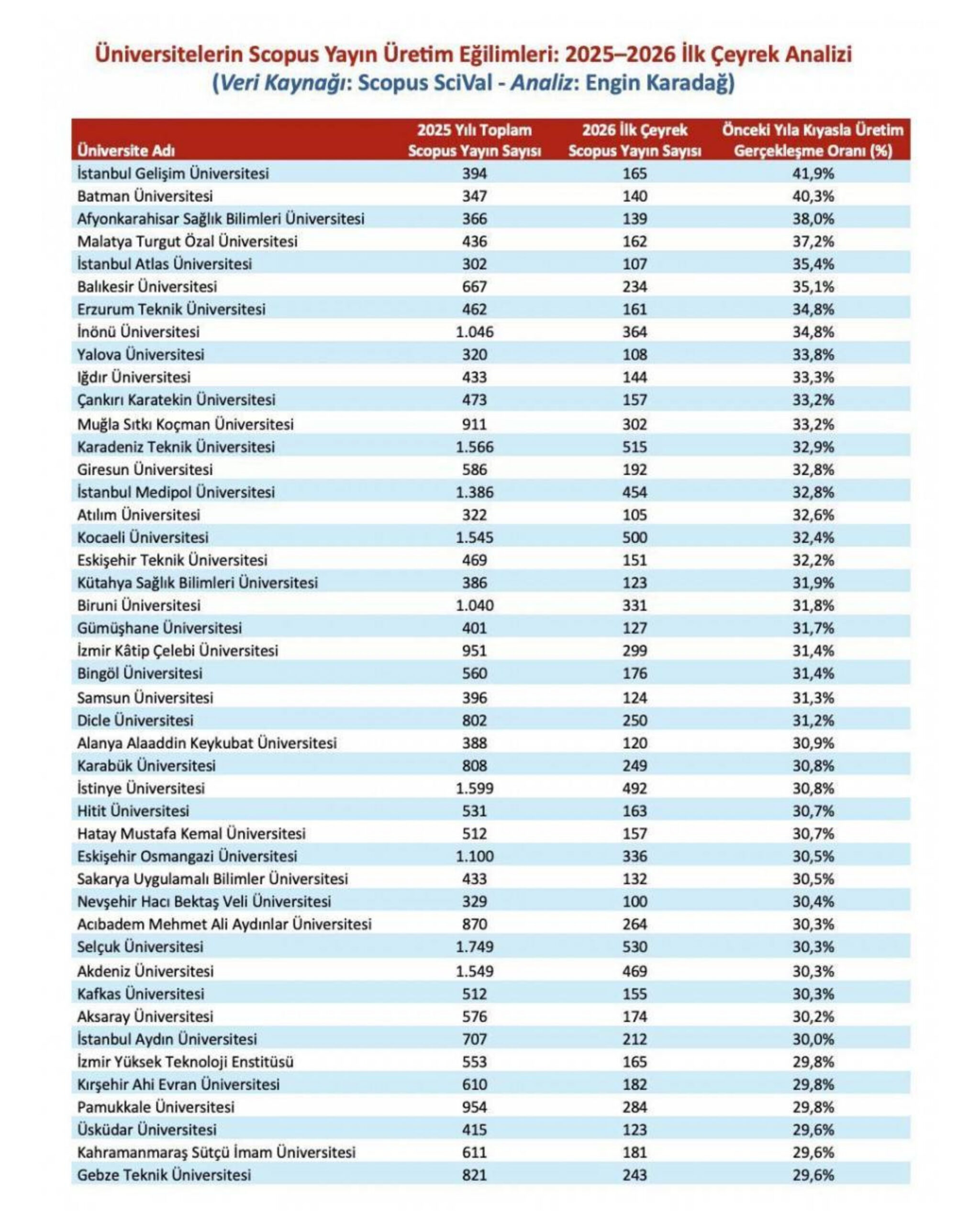 TÜBA Genç Akademi Üyesi Prof. Dr. Engin Karadağ tarafından hazırlanan ve Elsevier’in SciVal verilerine dayanan rapora göre, AFSÜ 2026’nın ilk çeyreğinde rekor bir büyüme yakaladı. Geçtiğimiz yılın aynı dönemine oranla akademik yayın üretimini %38 artıran üniversite, bu ivmesiyle Türkiye genelinde 3. sıraya yerleşti.