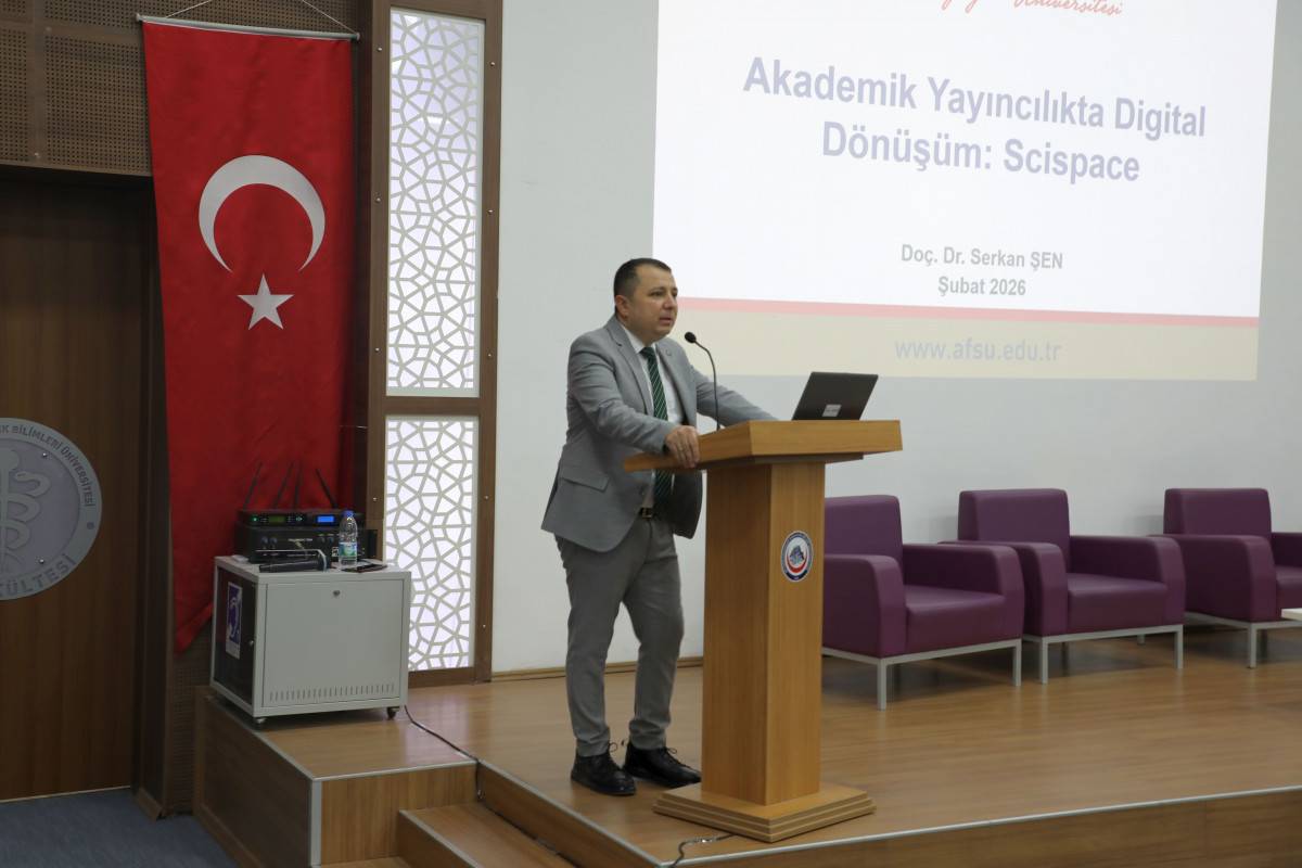 Afyonkarahisar Sağlık Bilimleri Üniversitesi (AFSÜ) akademik personeline yönelik “Akademik Yayıncılıkta Dijital Dönüşüm – SciSpace” konulu eğitim, AFSÜ Tıp Fakültesi Mavi Salon’da gerçekleştirildi.