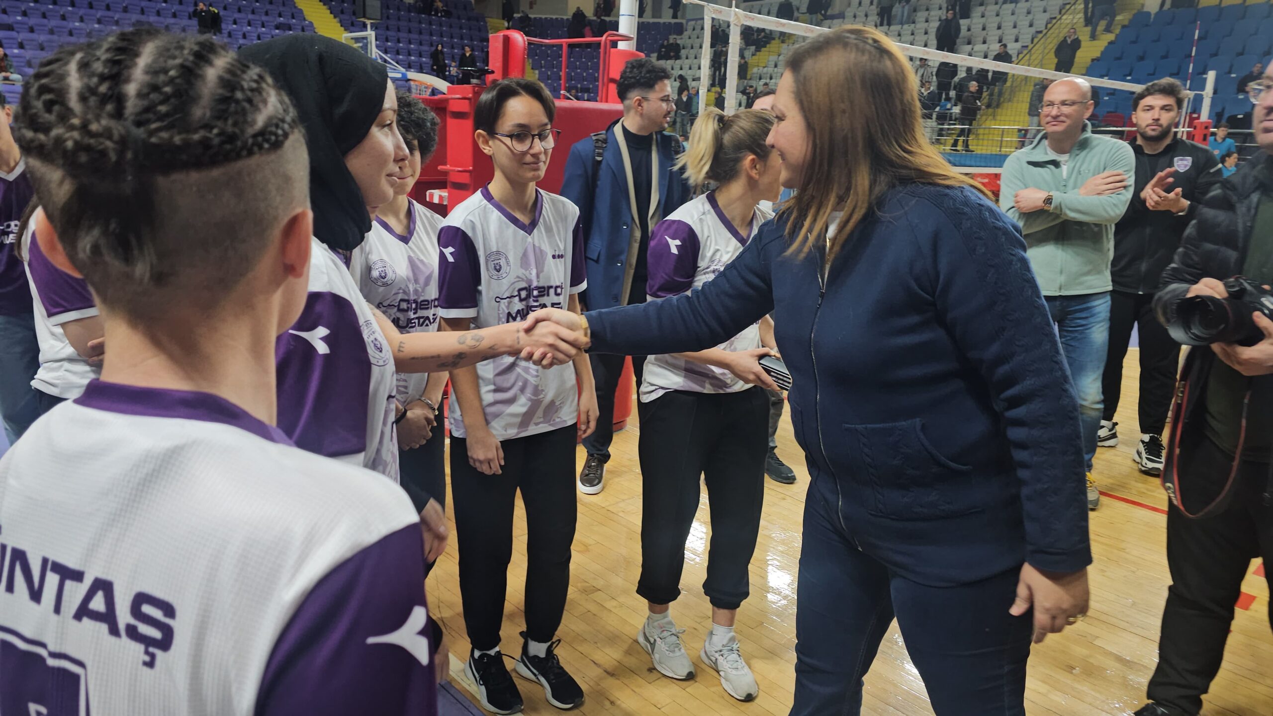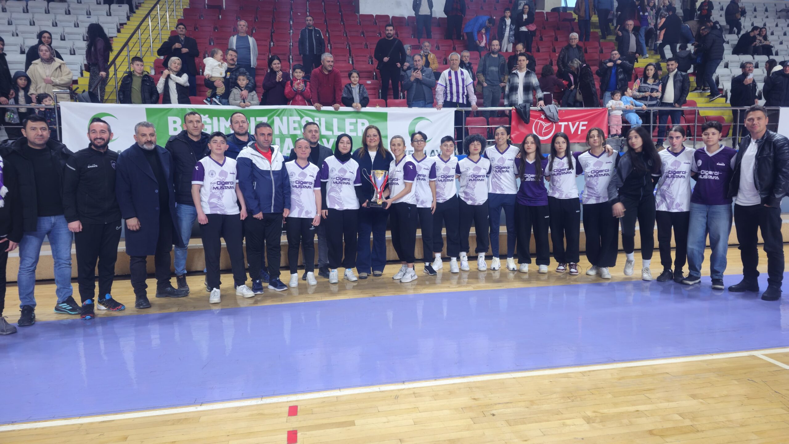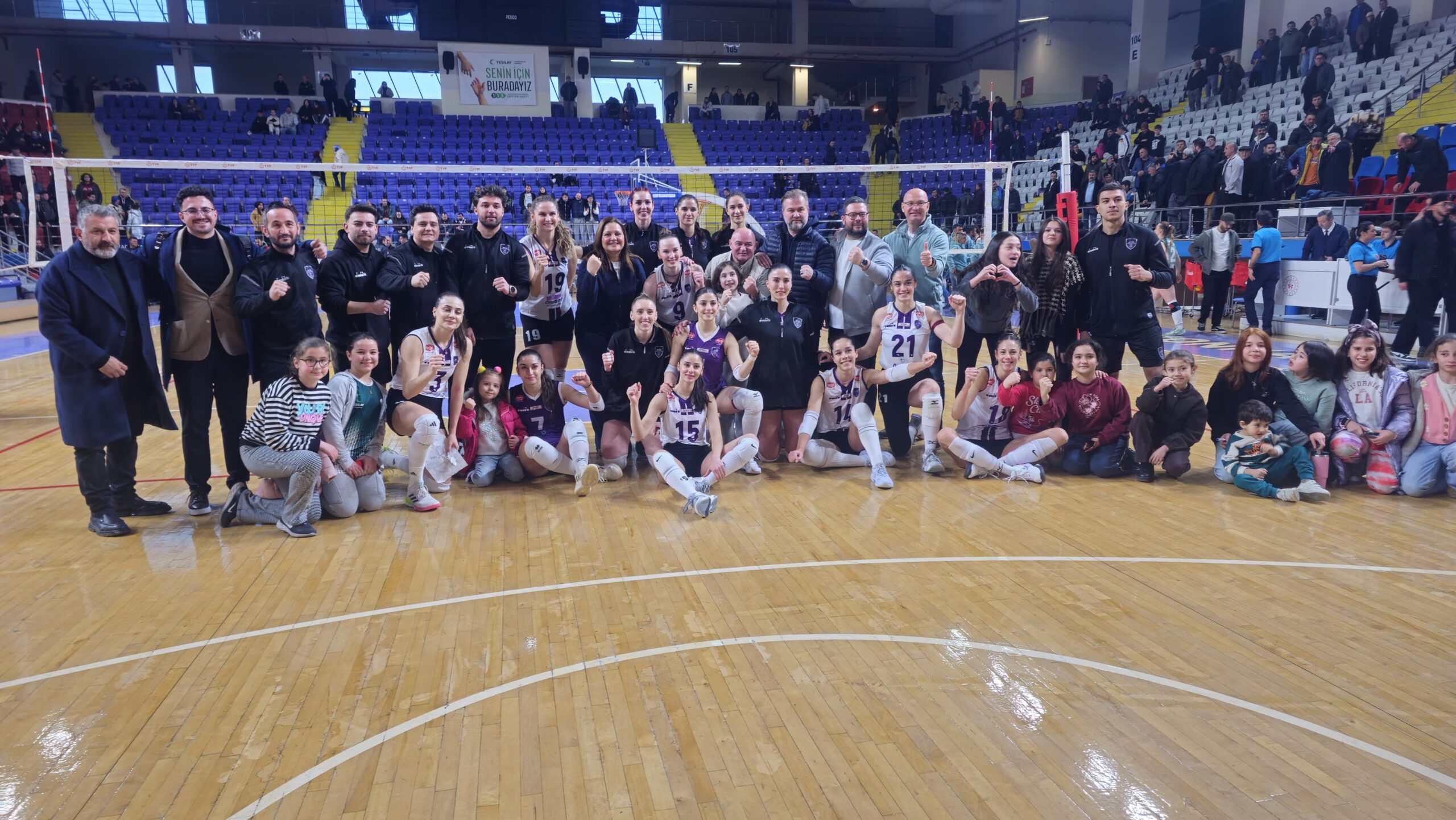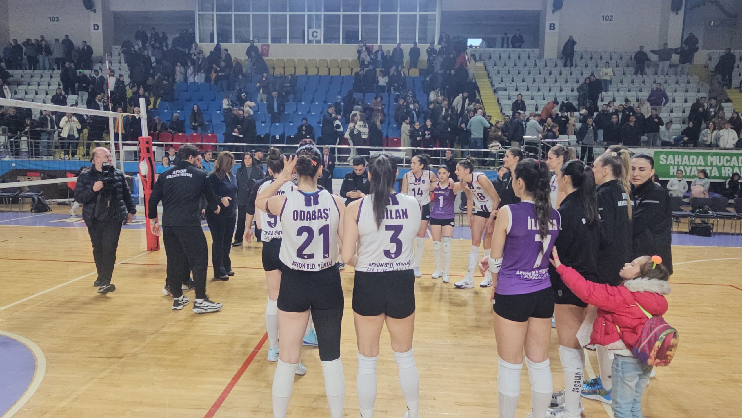 Salonun büyük bölümünü dolduran taraftarlar, “Zaferin Sultanları”nı maç boyunca coşkuyla destekledi.