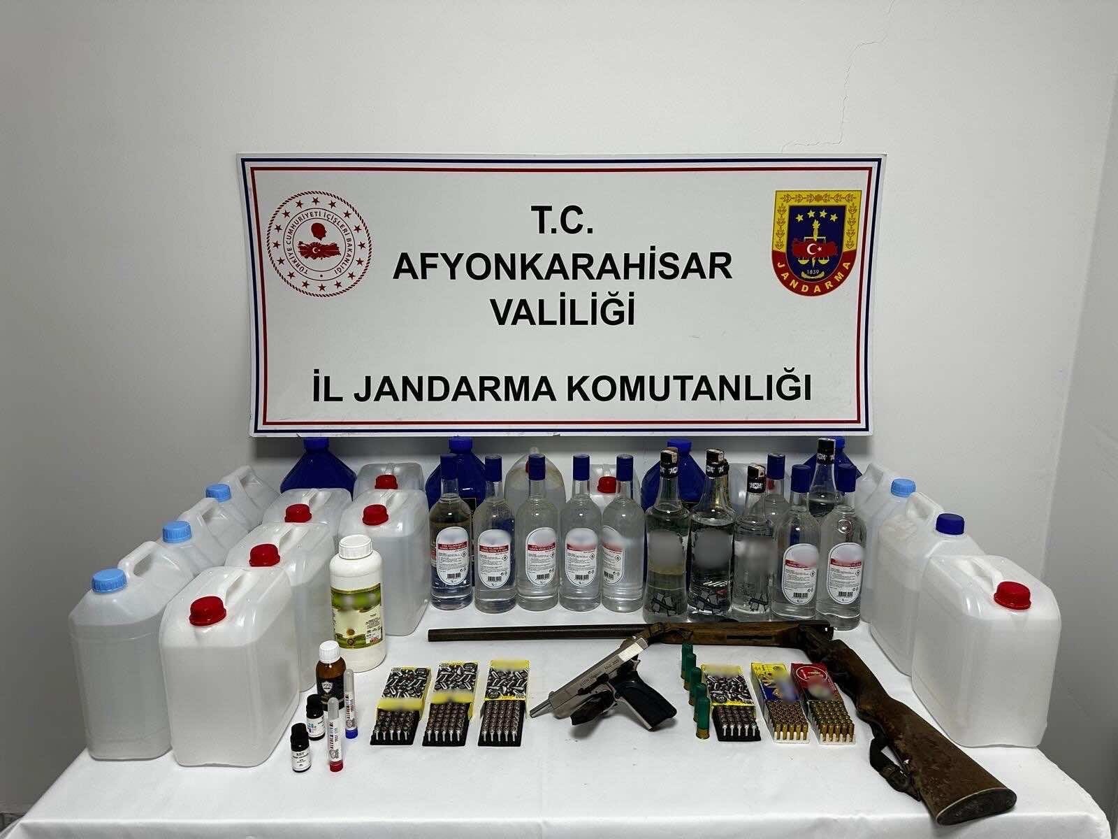 Öte yandan Şuhut ilçesine bağlı Oynağan köyü’nde adli makamlardan alınan arama kararı doğrultusunda bir adrese operasyon düzenlendi. Yapılan aramalarda; 93 litre etil alkol, 2 adet alkol tatlandırıcı kiti, 2 adet test kiti, 1,1 litre alkol tatlandırıcı, 5 litre el yapımı alkol, 1 adet ruhsatsız av tüfeği, 1 adet ruhsatsız kurusıkı tabanca, 100 adet 9 mm tabanca fişeği, 5 adet av tüfeği kartuşu ve 173 adet kurusıkı tabanca fişeği ele geçirildi. Olayla ilgili H.H.S. ve T.S. isimli şahıslar hakkında 5607, 6136, 2521 ve 5729 sayılı kanunlara muhalefet suçlarından yasal işlem başlatıldı.