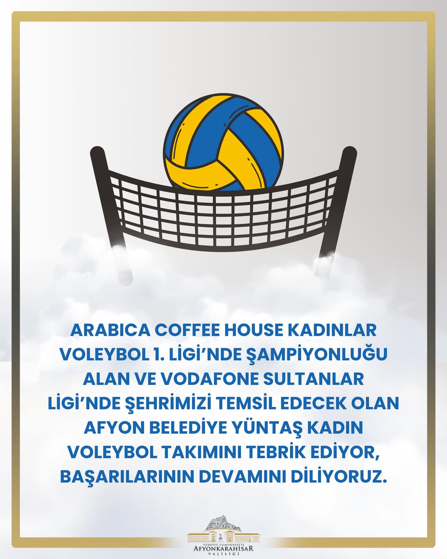 Afyonkarahisar Valiliği, Arabica Coffee House Kadınlar Voleybol 1. Ligi’nde şampiyon olarak Vodafone Sultanlar Ligi’ne yükselen Afyon Belediye Yüntaş Kadın Voleybol Takımı için tebrik mesajı yayımladı.