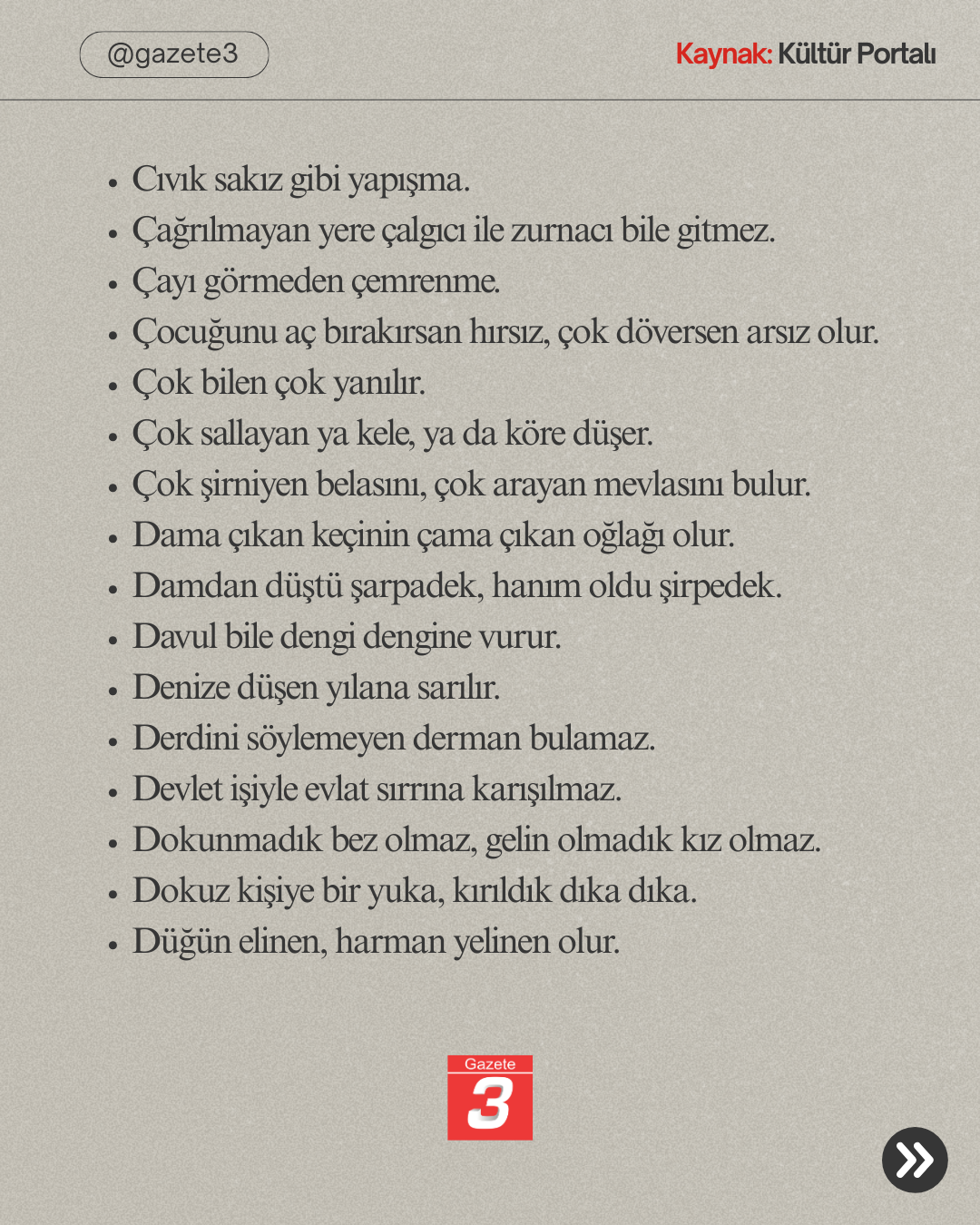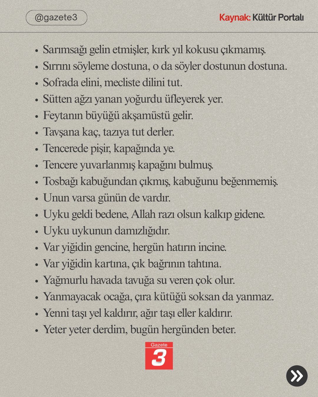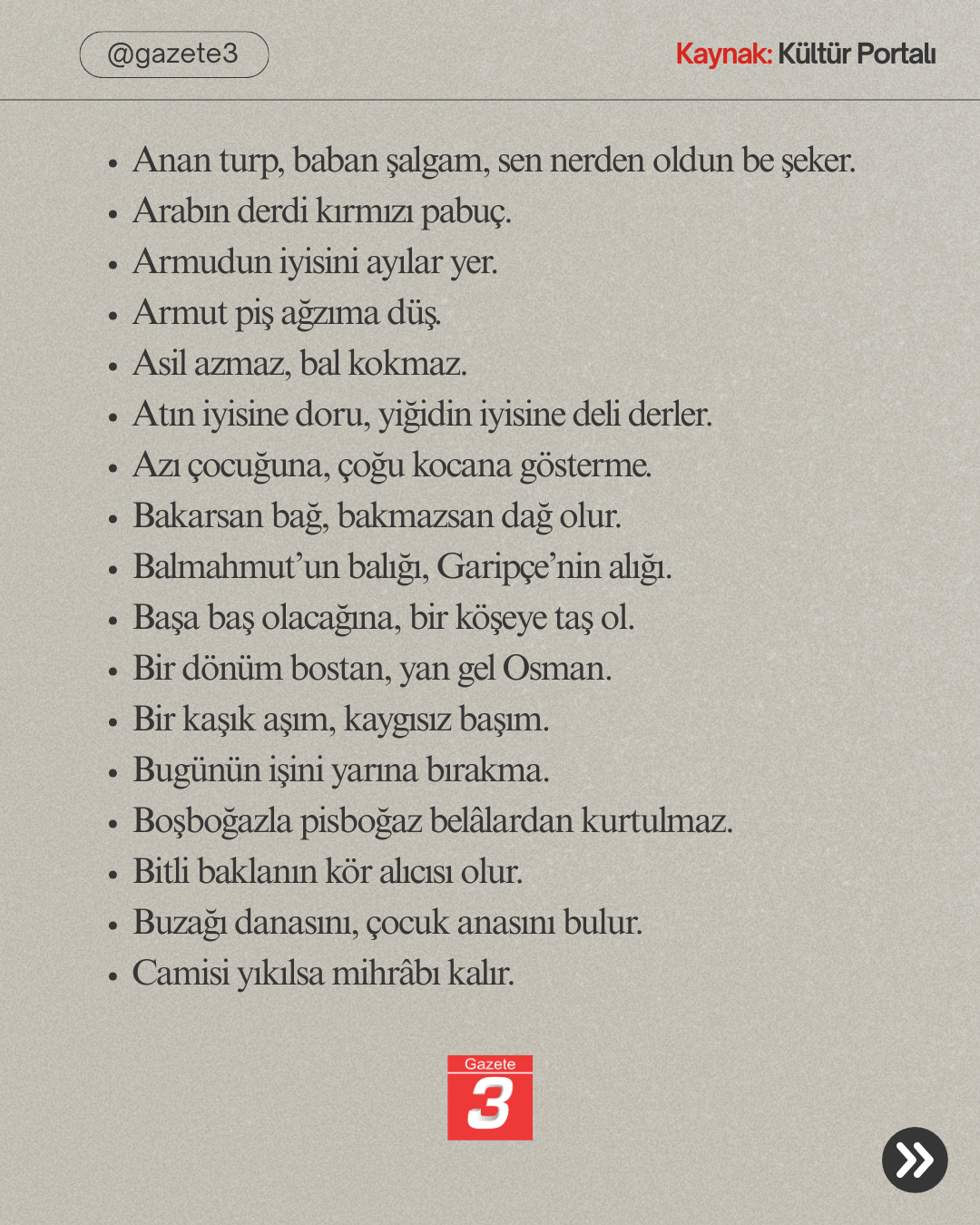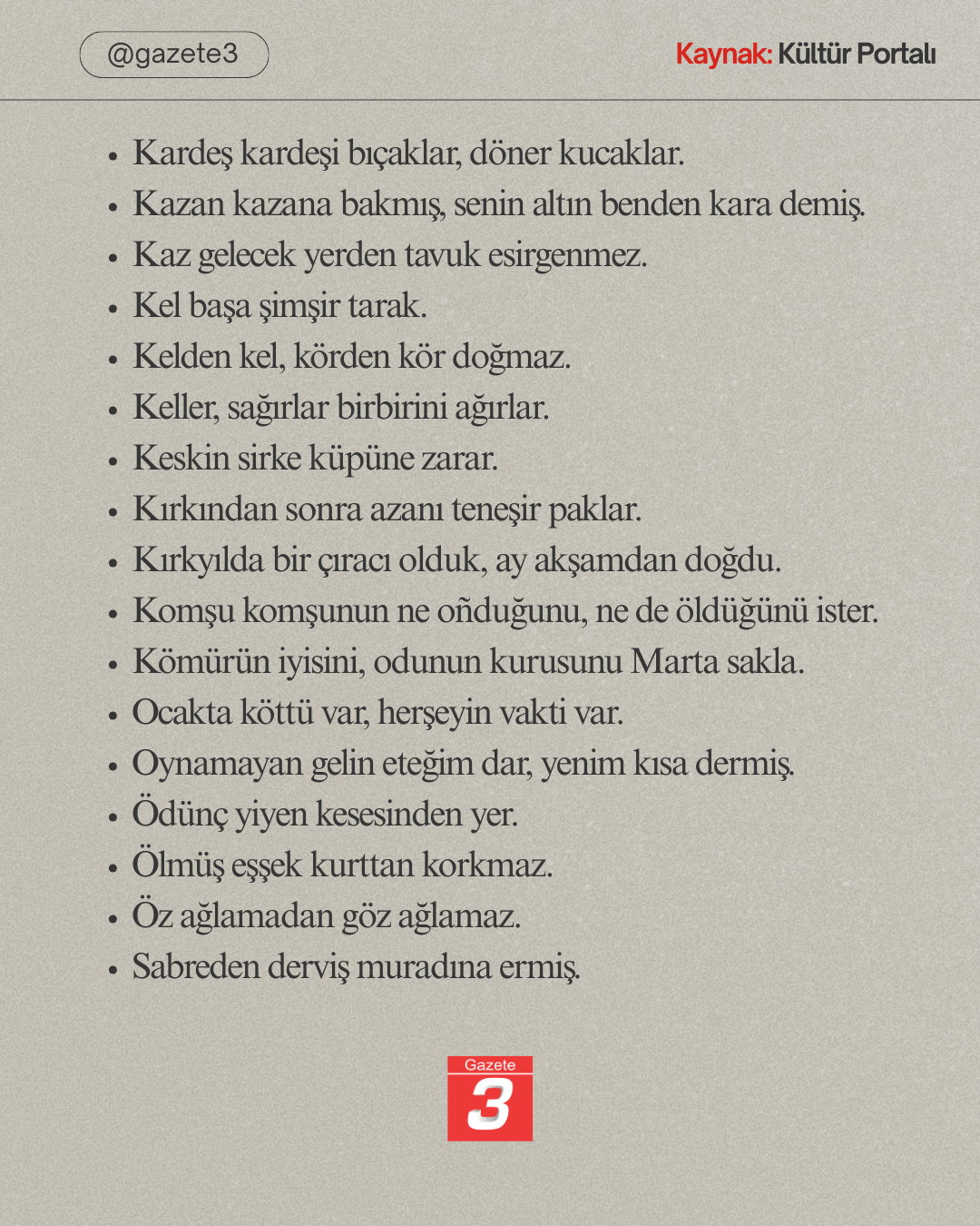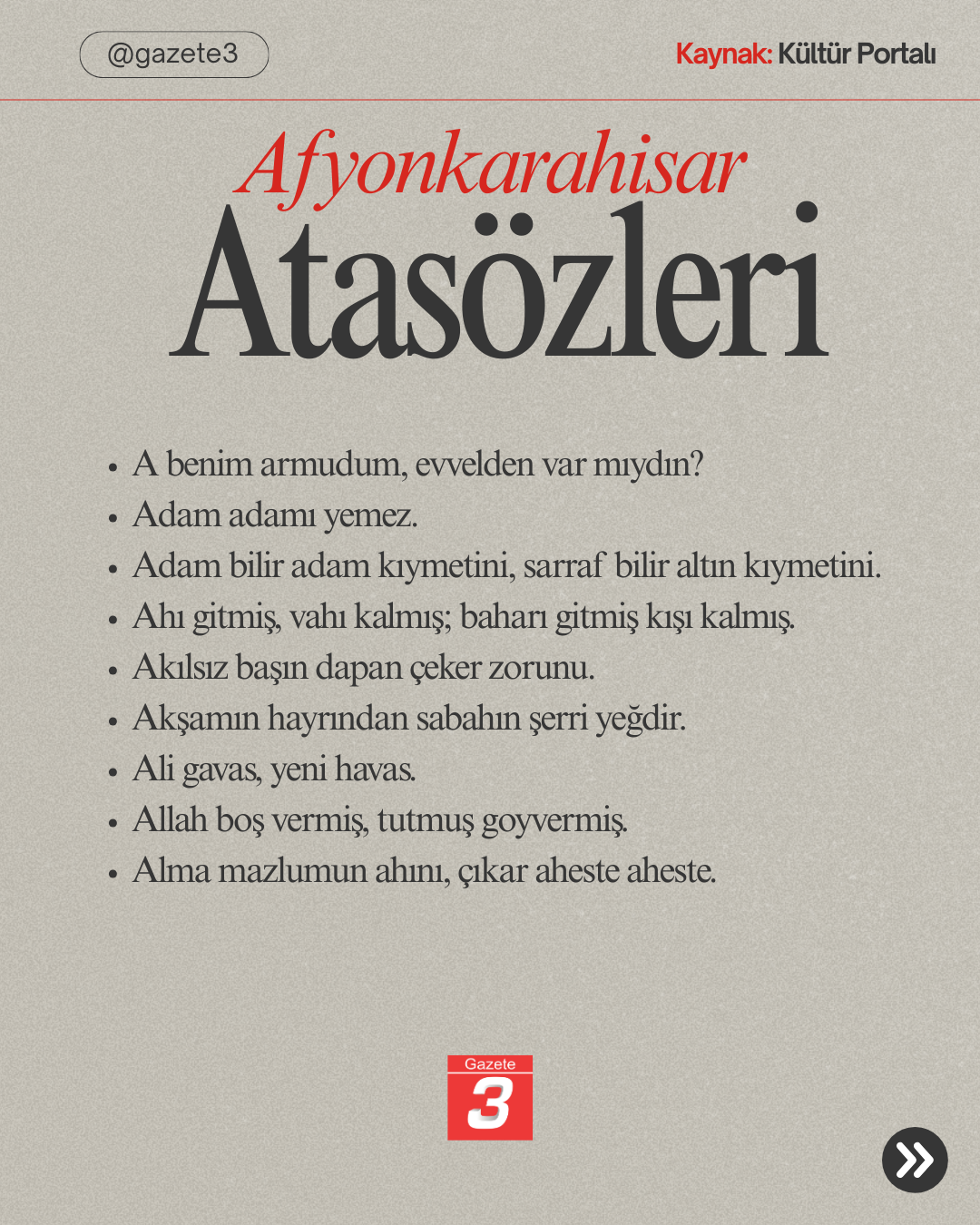 Ana Sayfa › Tüm Haberler › Afyonkarahisar’a ait Atasözleri! Afyonkarahisar’a ait Atasözleri! Giriş: 24-01-2026 12:42Güncelleme: 24-01-2026 12:44 Tüm Haberler ABONE OL Türkiye Kültür Portalı’nda yer alan bilgilere göre, Afyonkarahisar’a ait olduğu belirtilen bazı atasözleri yukarıda sıralanmaktadır Kaynak: https://www.kulturportali.gov.tr/turkiye/afyonkarahisar/kulturatlasi/atasozleri980296 16 26 36 46 56 66
