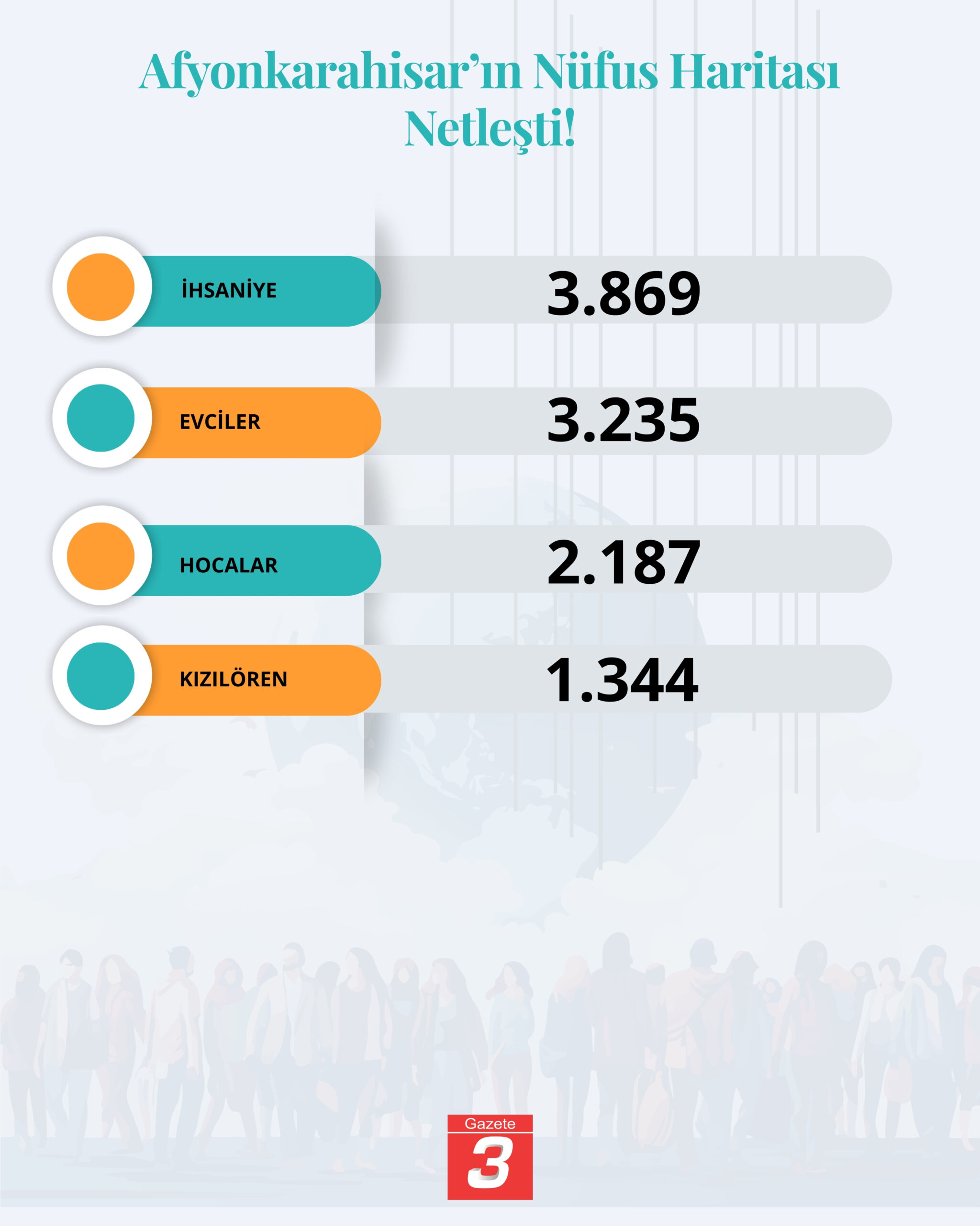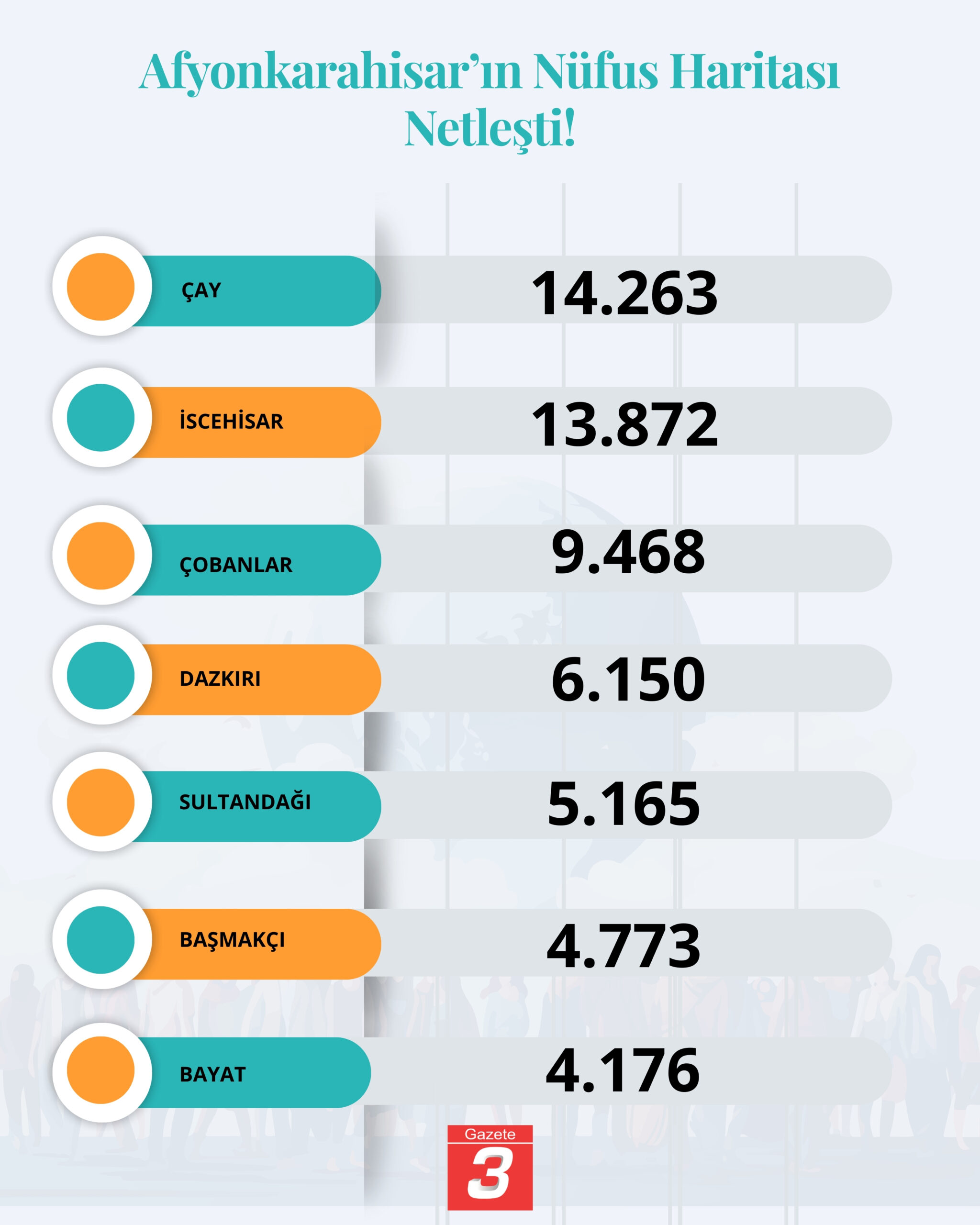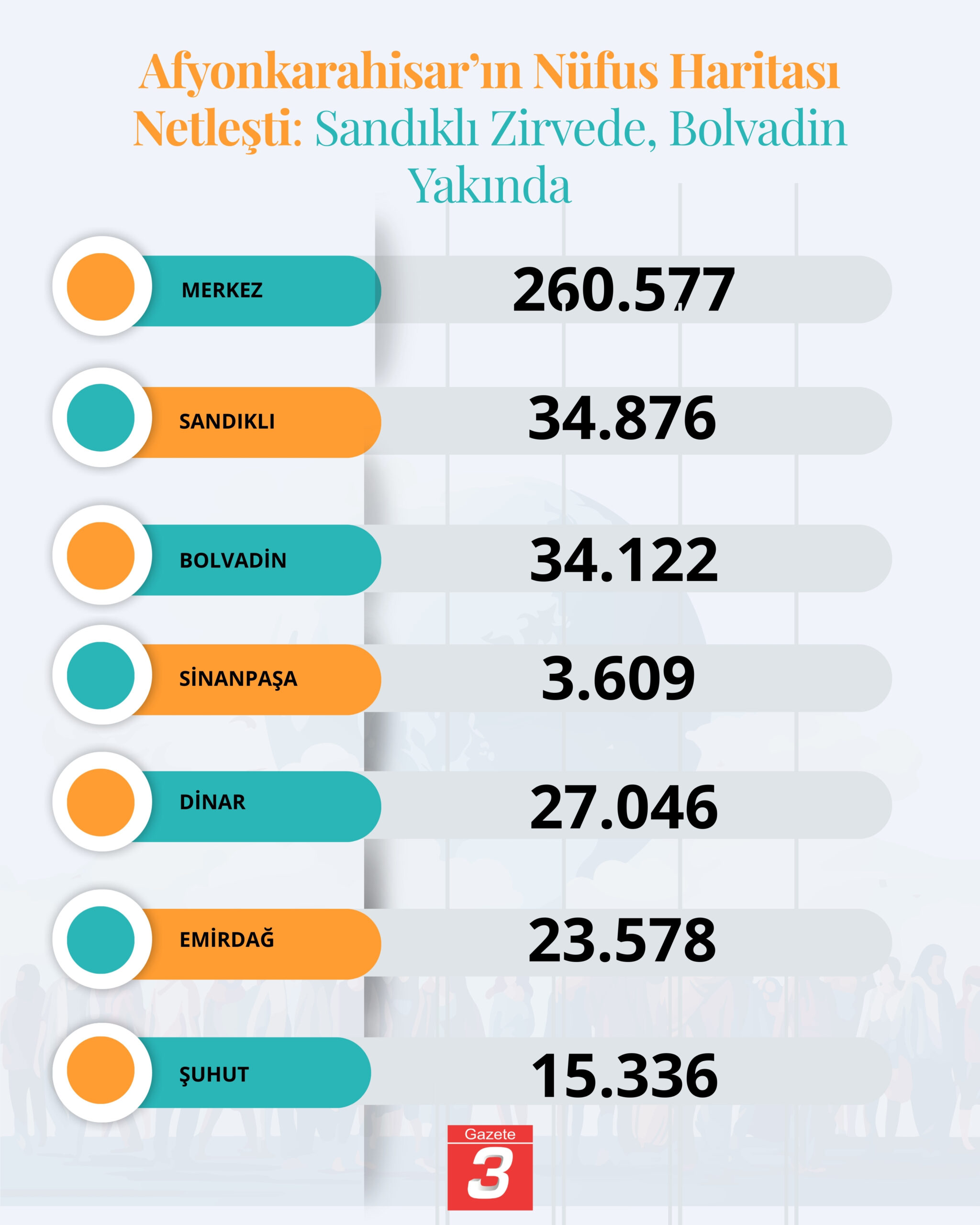 TÜİK’in 2025 yılı verilerine göre Afyonkarahisar’ın nüfusu 751 bin 808’e yükseldi. Merkez ilçe 331 bin 982 kişiyle büyümesini sürdürürken, Sandıklı 54 bin 376 nüfusla en kalabalık ilçe olma özelliğini korudu. Bolvadin ise 45 bin 906 nüfusla Sandıklı’yı yakından takip ederek aradaki farkı kapattı. Yıllık bazda Merkez, Bolvadin, Çobanlar, Dazkırı ve İscehisar nüfus artışı yaşayan ilçeler oldu. En fazla nüfus kaybı ise Kızılören’de görüldü. Sadece ilçe merkezleri baz alındığında Sandıklı 34 bin 876 kişiyle ilk sırada yer alırken, Bolvadin 34 bin 122 kişiyle ikinci oldu. En sakin ilçe merkezi ise 1.344 nüfusla Kızılören olarak kayıtlara geçti. >>>Haber Merkezi