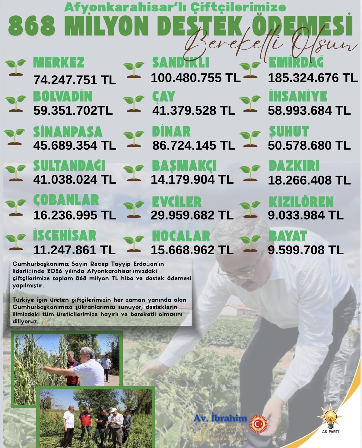 Cumhurbaşkanı Recep Tayyip Erdoğan’ın liderliğinde yürütülen tarım politikaları kapsamında, Afyonkarahisar genelindeki çiftçilere yönelik hibe ve destek ödemelerinde rekor seviyeye ulaşıldı. AK Parti Afyonkarahisar Milletvekili İbrahim Yurdunuseven, 2026 yılı boyunca ildeki üreticilere toplam 868 milyon TL ödeme yapıldığını duyurdu.