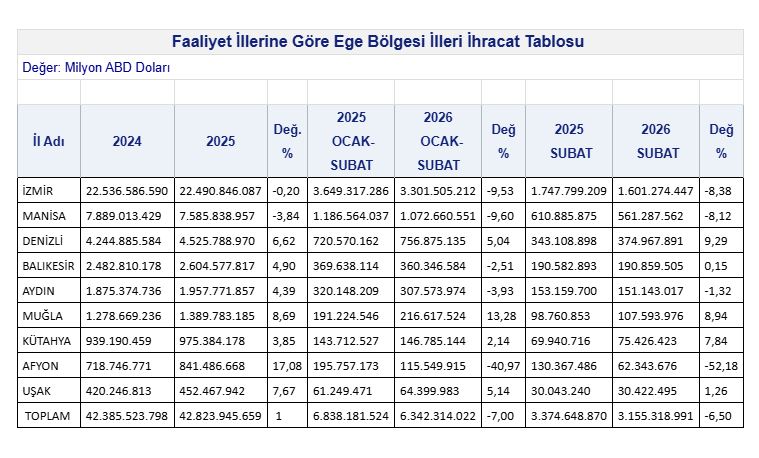 Ege Bölgesi, 2025 yılının ocak – şubat döneminde 6,8 milyar dolar ihracat yapmışken 2026 yılının aynı döneminde 6,3 milyar dolar ihracat yapabildi. Ege Bölgesi’nin ihracatı şubat ayında ise; yüzde 6,5’luk azalışla 3 milyar 374 milyon dolardan 3 milyar 155 milyon dolara indi. Ege Bölgesi ihracatındaki keskin düşüşün yüzde 93’e tekabül eden 462 milyon dolarlık büyük kısmı Ege Bölgesi ihracatının yüzde 70’ine imza atan İzmir ve Manisa ihracatındaki kayıplar kaynaklı oldu.
