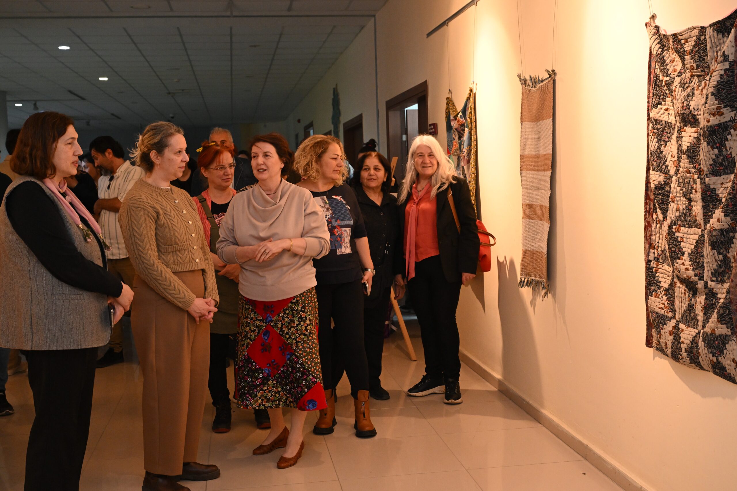 Fakülte binasında gerçekleştirilen sergilerden ilki GTS Bölümü son sınıf öğrencisi Gülhan Öztabak tarafından yürütülen “Geleneksel Sanatlarda Atık Kumaşın İleri Dönüşüm Malzemesi Olarak Kullanımının Araştırılması” başlıklı TÜBİTAK 2209-A projesi kapsamında açıldı. Danışmanlığını GTS Bölüm Başkanı Doç. Ülkü Küçükkurt’un yaptığı projenin çıktılarının sergilendiği programın açılışında GSF Dekanı Prof. Dr. Şerife Ebru Okuyucu, AKÜ Sürdürülebilirlik Koordinatörü Prof. Dr. Emine Hesna Kandır, GSF Dekan Yardımcıları Dr. Öğretim Üyesi Sena Coşkun, Dr. Öğretim Üyesi Fevzi Nuri Kara, Bölüm Başkanları, öğrenciler ve Afyonkarahisarlı sanatseverler yer aldı. Sürdürülebilirlik konusunda farkındalık yaratmak amacıyla kumaş atıkları, fermuar, ayna, düğme, keçe, kilim ipleri, geçmişten gelen ve hatırası olan gelinlik parçaları, kot kumaşları, örtüler, danteller ve deri parçalarının yanı sıra ahşap kasnak ve dal parçaları kullanılarak dikiş, dokuma, örme, dövme keçe tekniği ve ebru sanatından yararlanılarak oluşturulan 24 adet çalışma, 10 Nisan tarihine kadar GSF zemin katında görülebilecek.