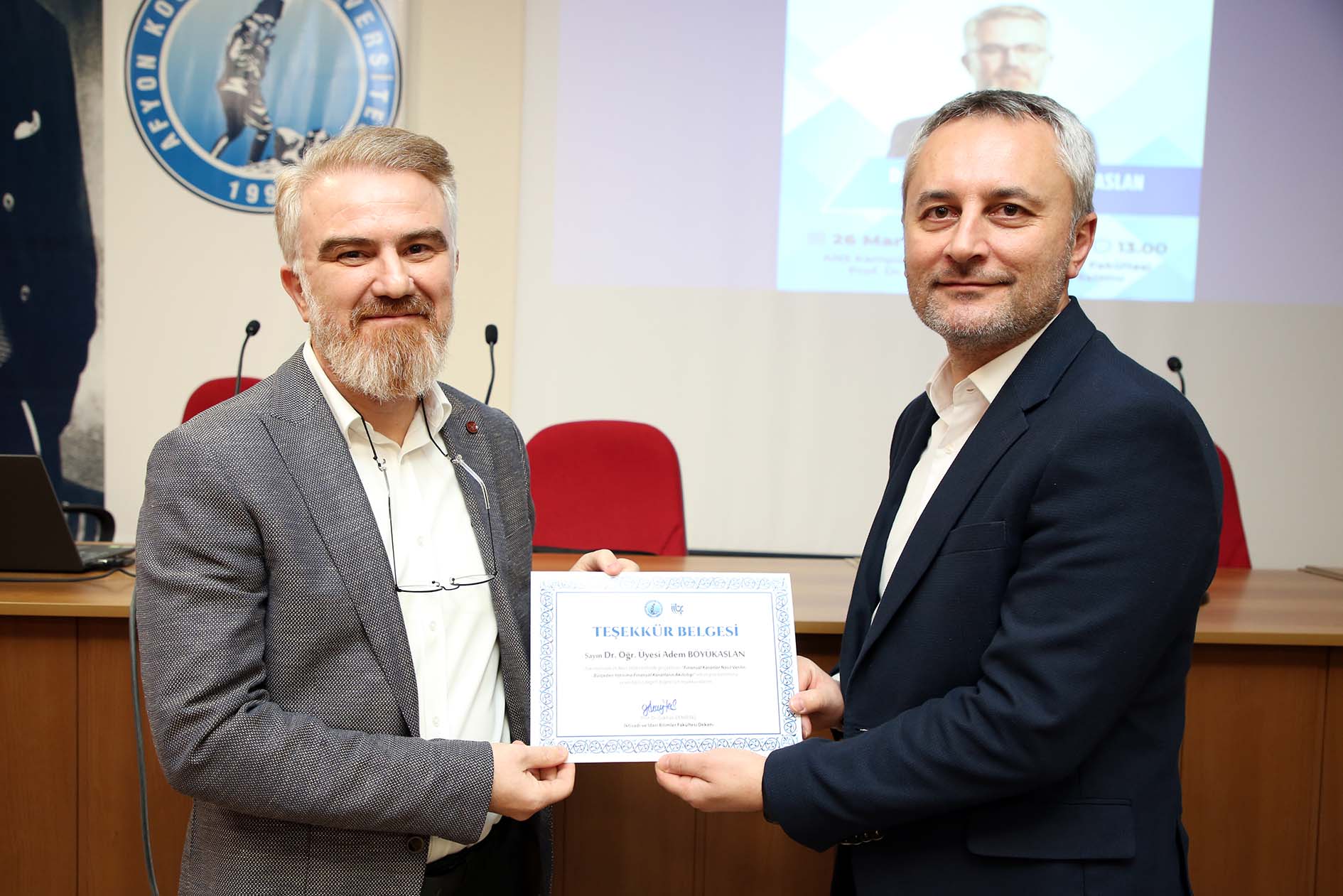Etkin piyasalar teorisine göre bilgilerin fiyatlara hızlı yansıdığını ancak bazı durumlarda fiyat hareketlerinin açıklanmasının zorlaştığını ifade eden Böyükaslan, bu durumun literatürde “anomali” olarak adlandırıldığını belirtti. Daniel Kahneman ve Amos Tversky tarafından geliştirilen “Beklenti Teorisi”ne de değinen Böyükaslan, bireylerin kararlarını genellikle kayıptan kaçınma eğilimiyle verdiğini, kaybın bireyler üzerinde kazançtan daha güçlü bir psikolojik etki bıraktığını sözlerine ekledi. Seminer, katılımcıların sorularının yanıtlanmasının ardından İİBF Dekanı Prof. Dr. Gökhan Demirtaş’ın Dr. Öğretim Üyesi Adem Böyükaslan’a teşekkür belgesi takdimi ve hatıra fotoğrafı çekilmesinin ardından sona erdi. >>>Haber Merkezi