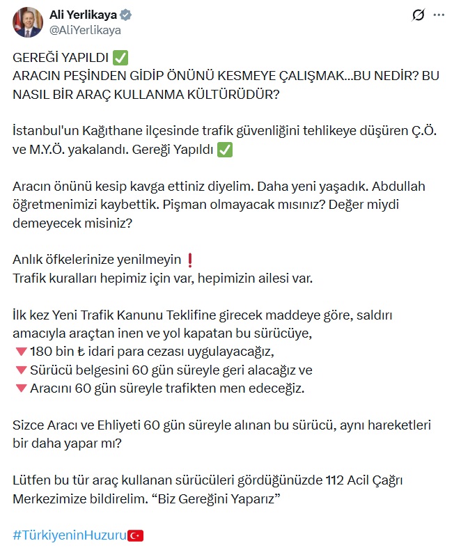 Vatandaşlara çağrıda bulunan Bakan Yerlikaya, trafikte benzer tehlikeli davranışlarla karşılaşıldığında 112 Acil Çağrı Merkezi’ne bildirim yapılması gerektiğini ifade ederek paylaşımını “Biz gereğini yaparız” mesajıyla tamamladı.