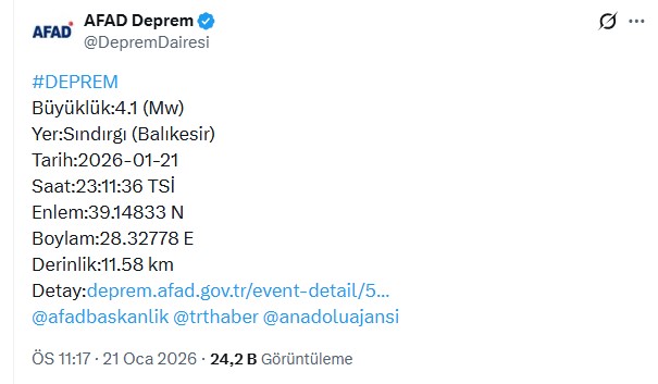AFAD, Balıkesir’in Sındırgı ilçesinde 4.4 ve 4.1 büyüklüğünde iki depremin daha meydana geldiğini duyurdu.