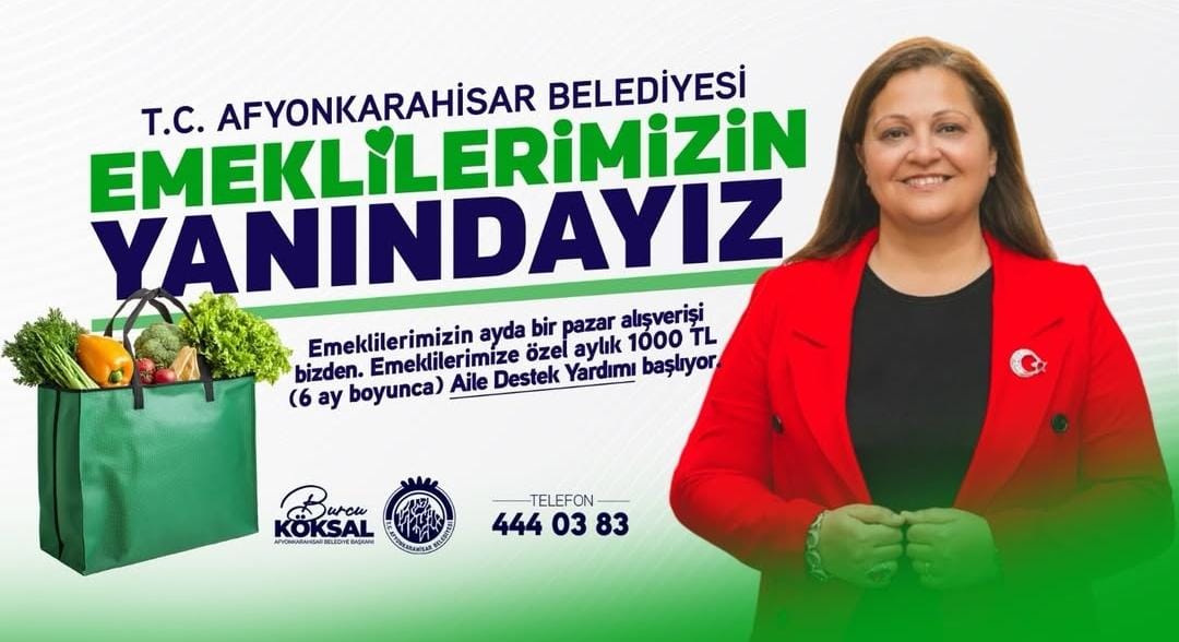 Afyonkarahisar Belediye Başkanı Burcu Köksal’ın sosyal medya hesabından paylaşılan görselde, emeklilere yönelik pazar alışverişi desteği ile aylık nakdi yardım uygulamasının başladığı bilgisine yer verildi. >>>Berna TÜRKSOY