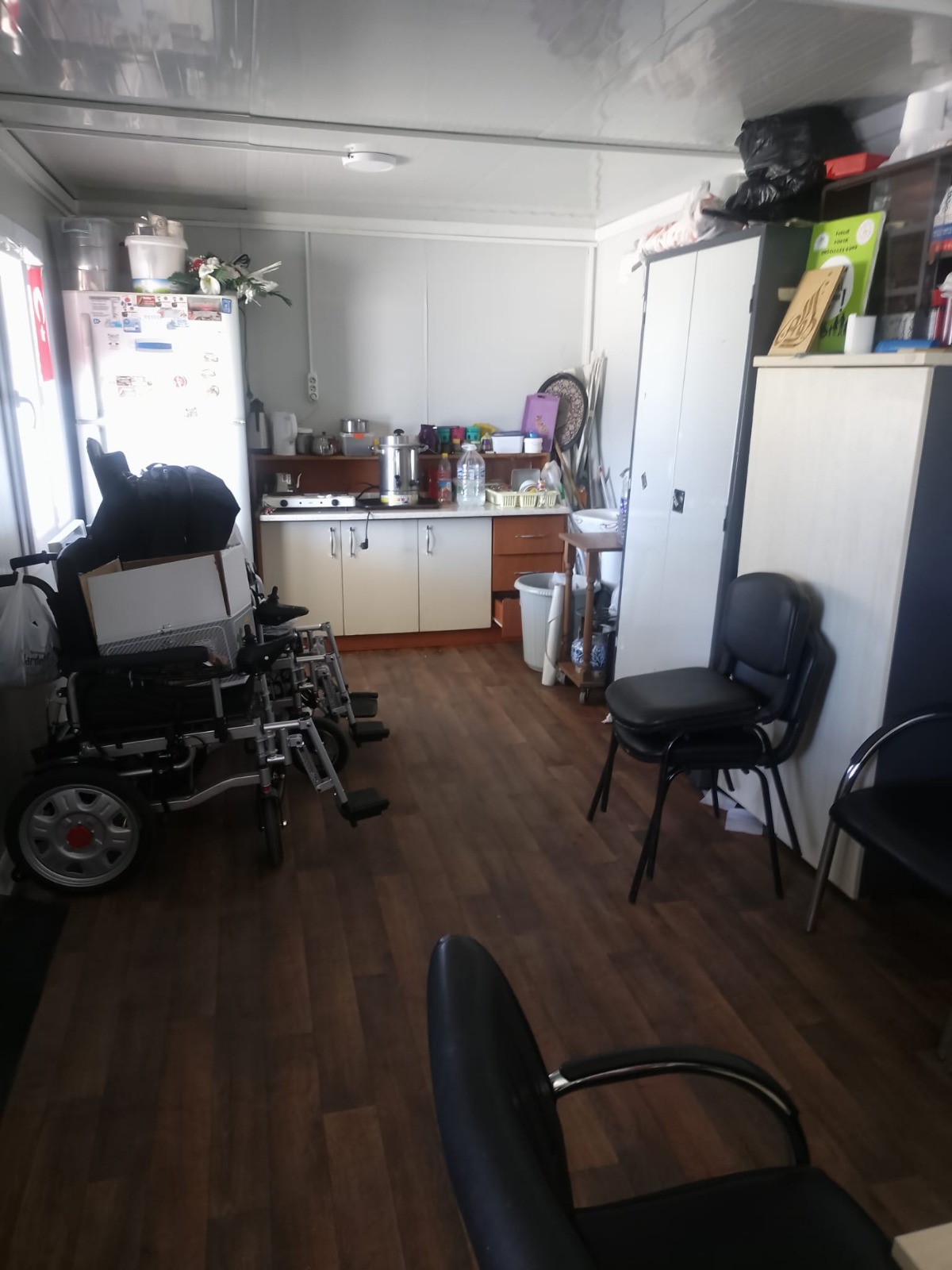 Engelli bireyler için oldukça sınırlı bir alan oluşturulmuş. Konteynır kapısı dar olduğu için tekerlekli ve akülü sandalyelerin önemli bir kısmı içeriye giremiyor. İçeriye giriş mümkün olsa bile, içeride rahat hareket edilebilecek geniş bir alanın bulunmadığı açıkça görülüyor. Isınma ise elektrikli ısıtıcı ile sağlanmaya çalışılıyor. Önceki dernek yerinde doğalgaz sistemi ve parke bir zemin bulunduğunu bildiğim için mevcut durumun daha sınırlı imkânlar sunduğu net şekilde anlaşılıyor.