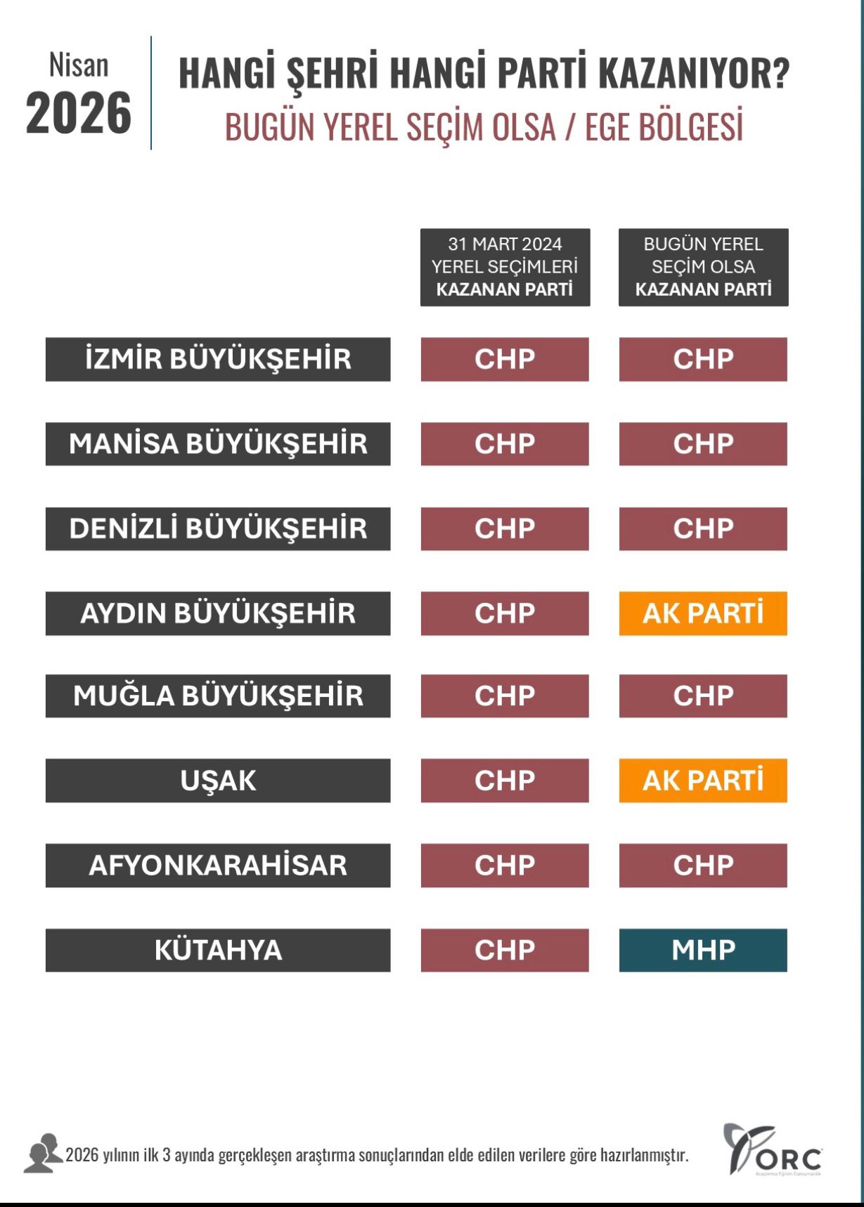 ORC Araştırma tarafından 2026 yılının ilk aylarında yapılan araştırma, Ege Bölgesi’ndeki seçmen eğilimlerine ışık tuttu. Ege Bölgesi genelinde yine Cumhuriyet Halk Partili belediyelerin anketlere göre seçimlerde vatandaşın tercihi olacağını gösterdi. Sonuçlara göre birkaç ilde dengelerin değişeceğine dikkat çekilirken, Afyonkarahisar başta olmak üzere bölge illerimizde de CHP yönetimleri başarılı görülüyor.