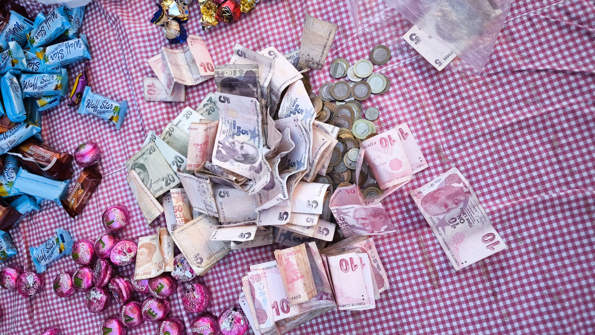 Komşular tarafından hazırlanan paketli ikramlıklar ve harçlıklar, geleneksel usule uygun şekilde bir örtüde toplandı ve program sonunda çocuklar arasında paylaştırıldı.