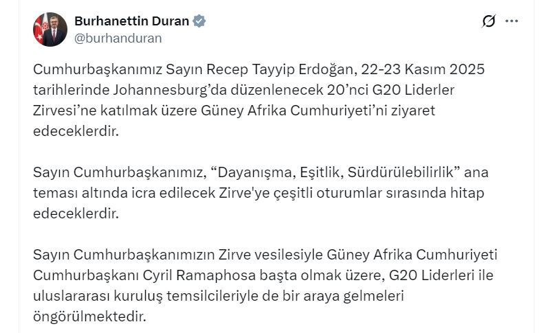 Cumhurbaşkanı Erdoğan, 22-23 Kasım 2025 tarihlerinde Güney Afrika Cumhuriyeti’ndeki G20 Liderler Zirvesi’ne katılacak. Zirvede, “Dayanışma, Eşitlik, Sürdürülebilirlik” ana teması çerçevesinde çeşitli oturumlarda hitap edecek.