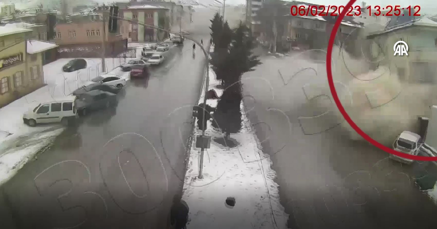 İlçenin Işıklar mevkisindeki MOBESE kameralarınca, 13.24’teki sarsıntıyla beraber dört katlı binanın park halindeki araçların üzerine yıkılması, bölgede oluşan toz bulutu ve sonrasında insanların yaşadığı panik saniye saniye kaydedildi.