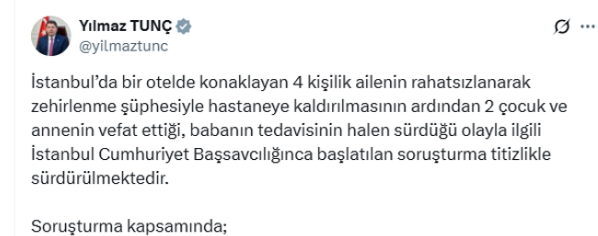 “İstanbul’da bir otelde konaklayan 4 kişilik ailenin rahatsızlanarak zehirlenme şüphesiyle hastaneye kaldırılmasının ardından 2 çocuk ve annenin vefat ettiği, babanın tedavisinin halen sürdüğü olayla ilgili İstanbul Cumhuriyet Başsavcılığınca başlatılan soruşturma titizlikle sürdürülmektedir.