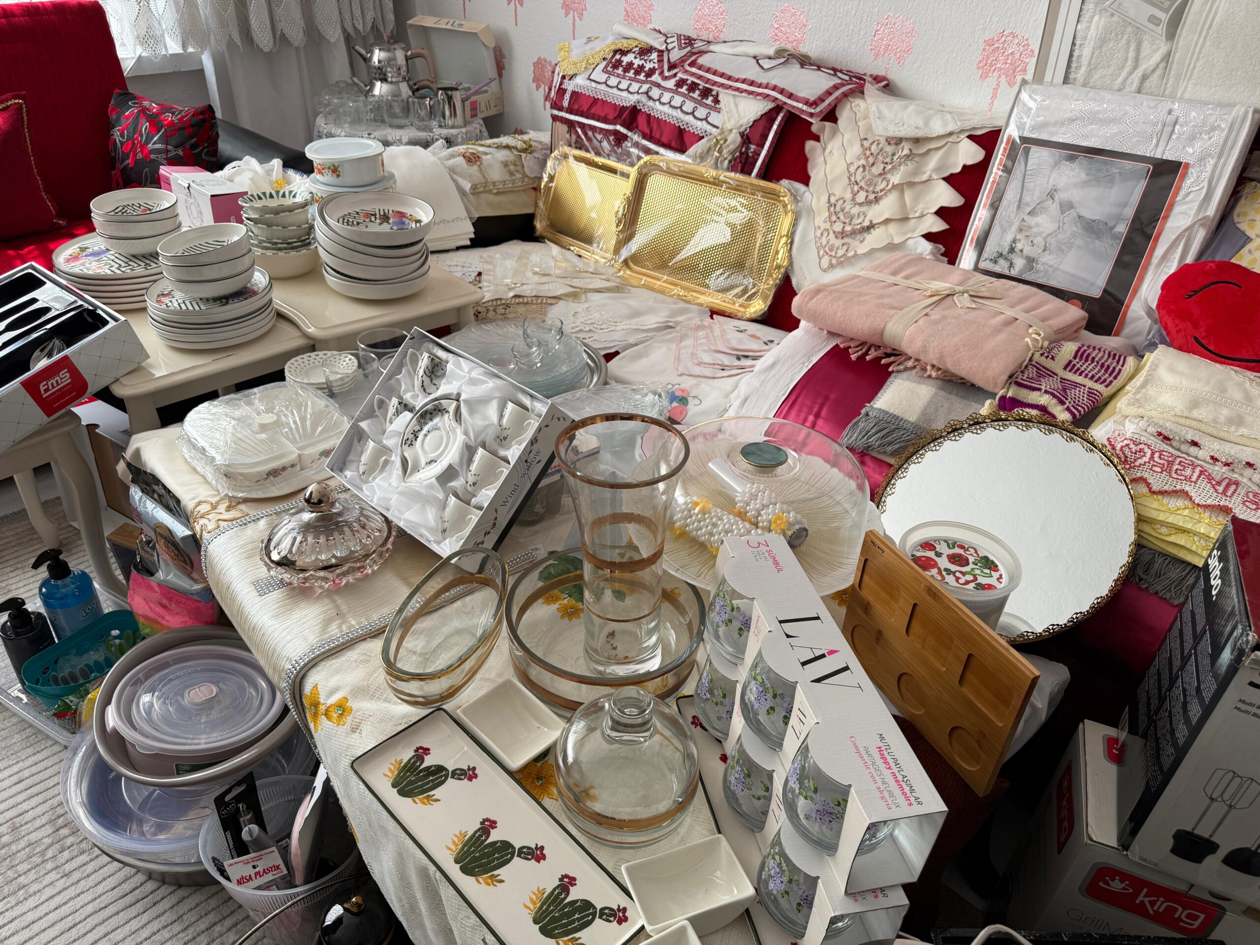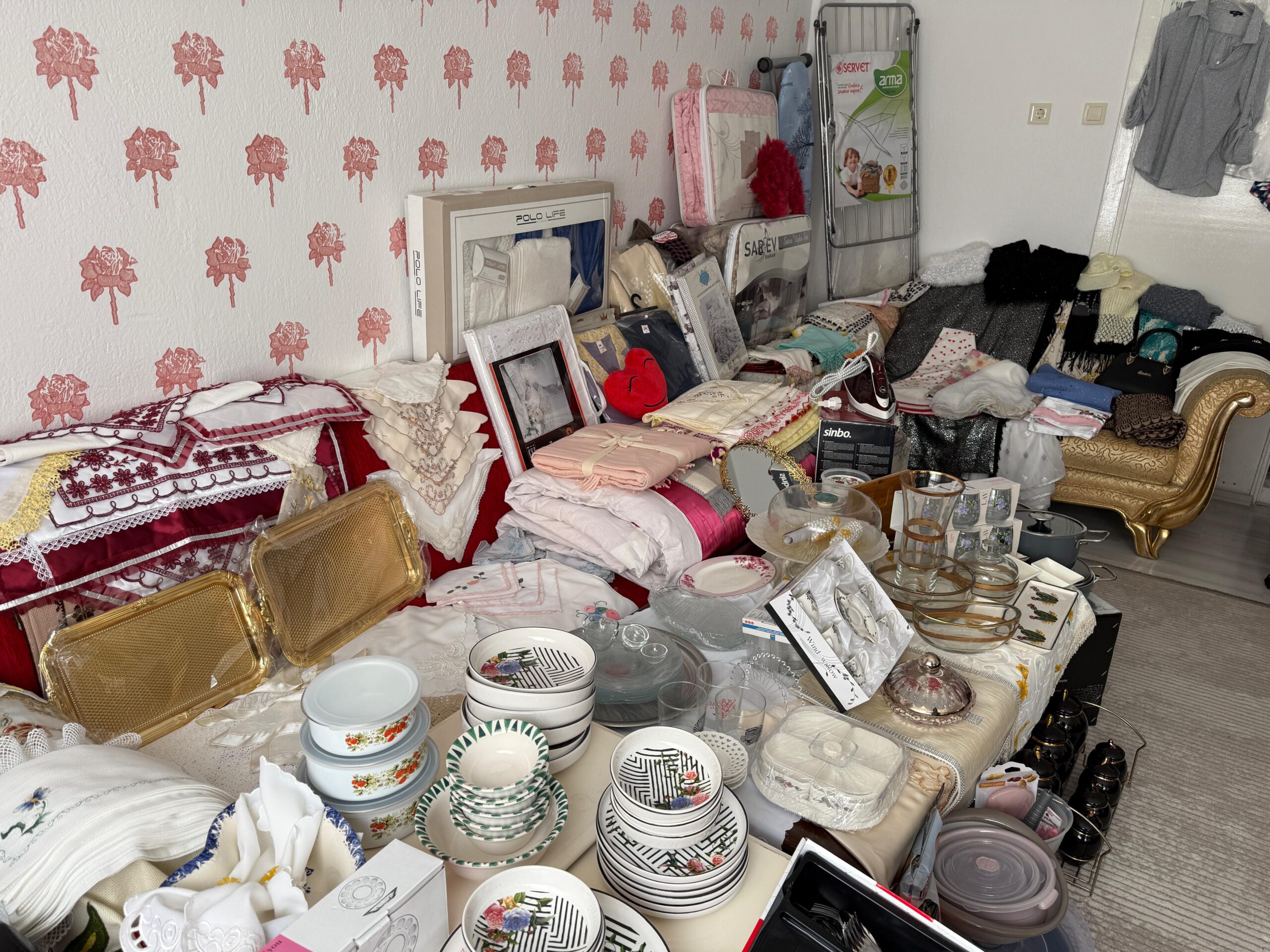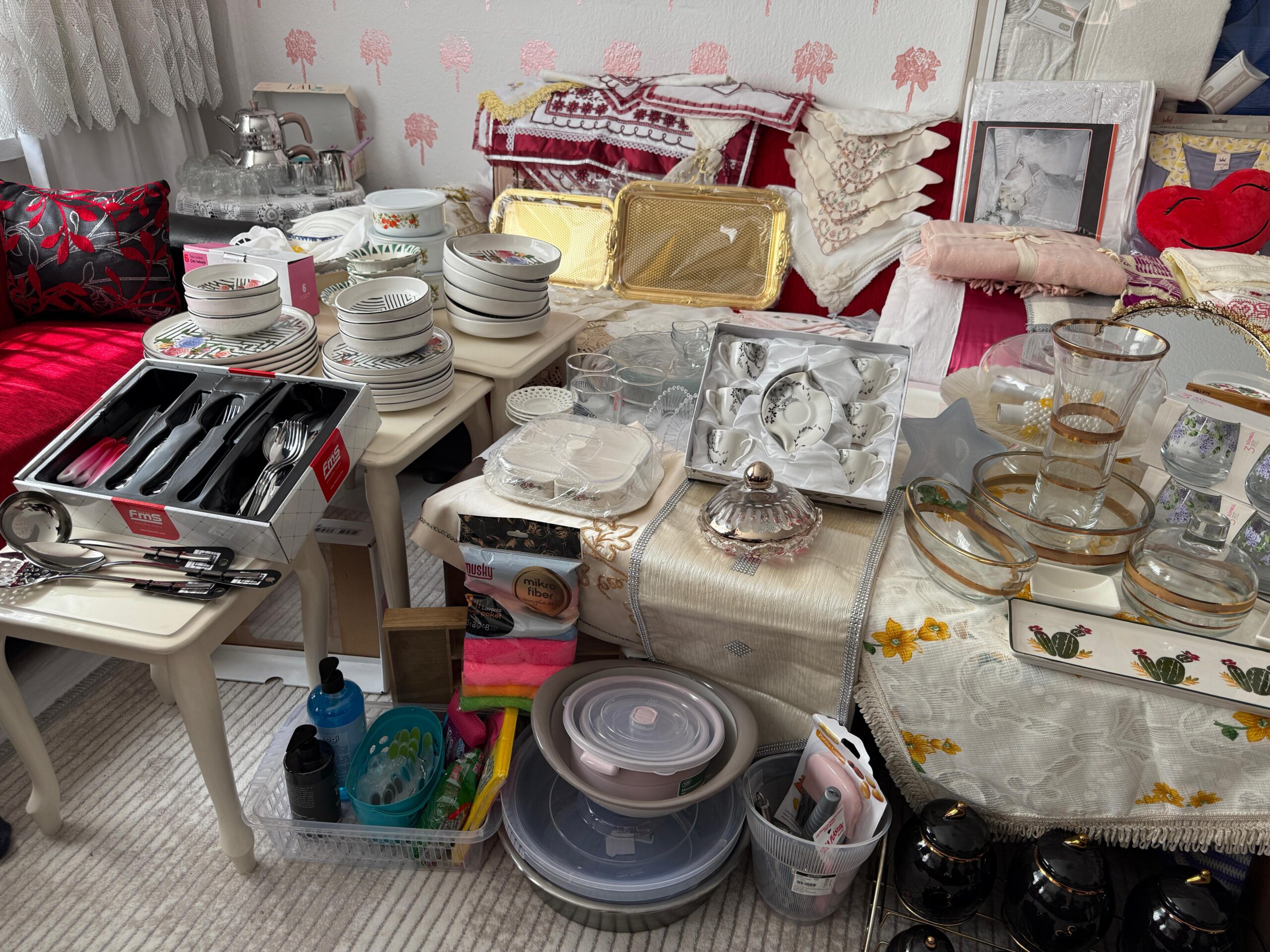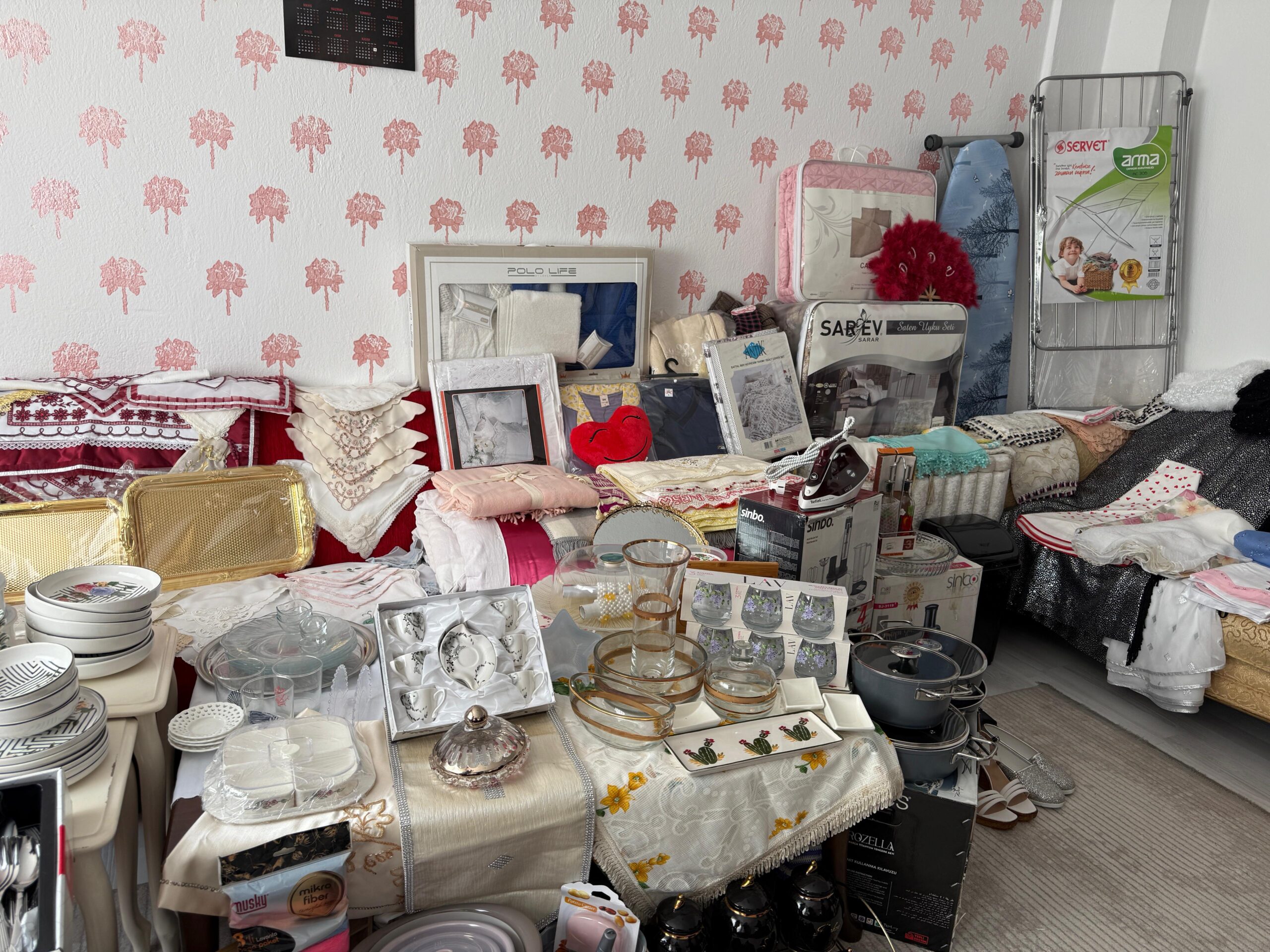 Hazırlanan çeyizde adeta yok yok. Yatak odası takımı, mutfak eşyaları, gecelikler, süs eşyaları, ütü, yorgan ve yatak örtüsü gibi birçok temel ihtiyaç eksiksiz şekilde temin edildi.