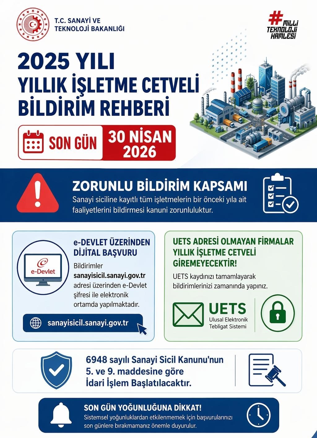 6948 sayılı Sanayi Sicil Kanunu’nun 5. maddesi uyarınca, sanayi sicil belgesine sahip olan tüm işletmelerin her yıl bir önceki yıla ait faaliyetlerini içeren bilgileri İl Müdürlüğü’ne iletmesi gerekiyor. İşletmelerin, bu verileri Sanayi Sicil Bilgi Sistemi üzerinden dijital ortamda doldurarak onaya sunmaları yasal bir zorunluluk olarak vurgulandı.