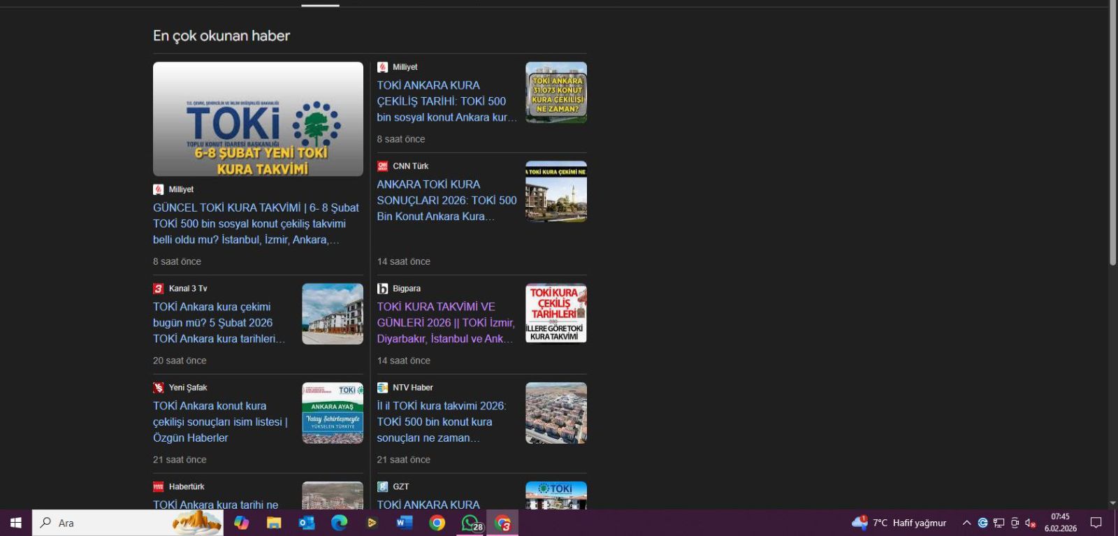 Geçtiğimiz günlerde yayımlanan “TOKİ Ankara kura çekimi bugün mü?” başlıklı haber, konut sahibi olmayı bekleyen binlerce vatandaş tarafından yoğun ilgi gördü. Anlık ve doğru bilgilerle hazırlanan haber, kısa sürede Google aramalarında üst sıralara yükselerek Kanal 3 TV’nin güvenilir haber kaynağı olduğunu bir kez daha ortaya koydu.