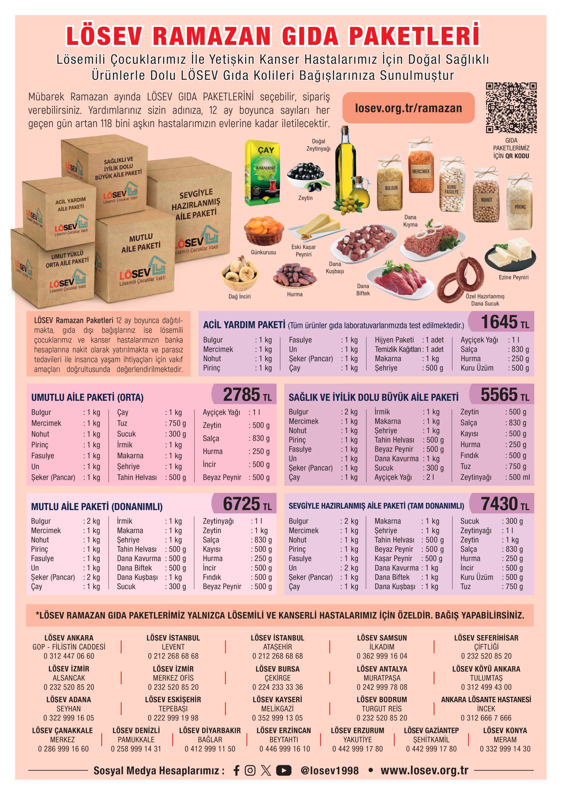 LÖSEV, Türkiye’nin dört bir yanındaki lösemi ve kanser tedavisi gören çocuk ve yetişkin kanser hastalarına, doğal, sağlıklı ürünlerle dolu LÖSEV Gıda Paketleri ulaştırıyor. “Önce Çocuklar İyileşsin” diyerek, binlerce gönüllü ve bağışçının destekleri ile gönderilecek gıda paketleri ile Ramazan ayı boyunca binlerce ailenin sofraları şenlenecek. Lösemili Çocuklar Sağlık ve Eğitim Vakfı LÖSEV, Türkiye genelinde sayıları 118 bini aşkın, Vakfa kayıtlı lösemi ve kanser tedavisi gören çocuk ve yetişkin hasta ve ailelerine, tamamen ücretsiz olarak sürdürdüğü tedavi, eğitim, konaklama hizmetlerinin yanı sıra sosyal ve psikolojik destekler, ayni ve nakdi yardımlarla tam 27 yıldır var gücüyle çalışıyor ve ailelerin tüm ihtiyaçlarına kalıcı çözümler sağlıyor.