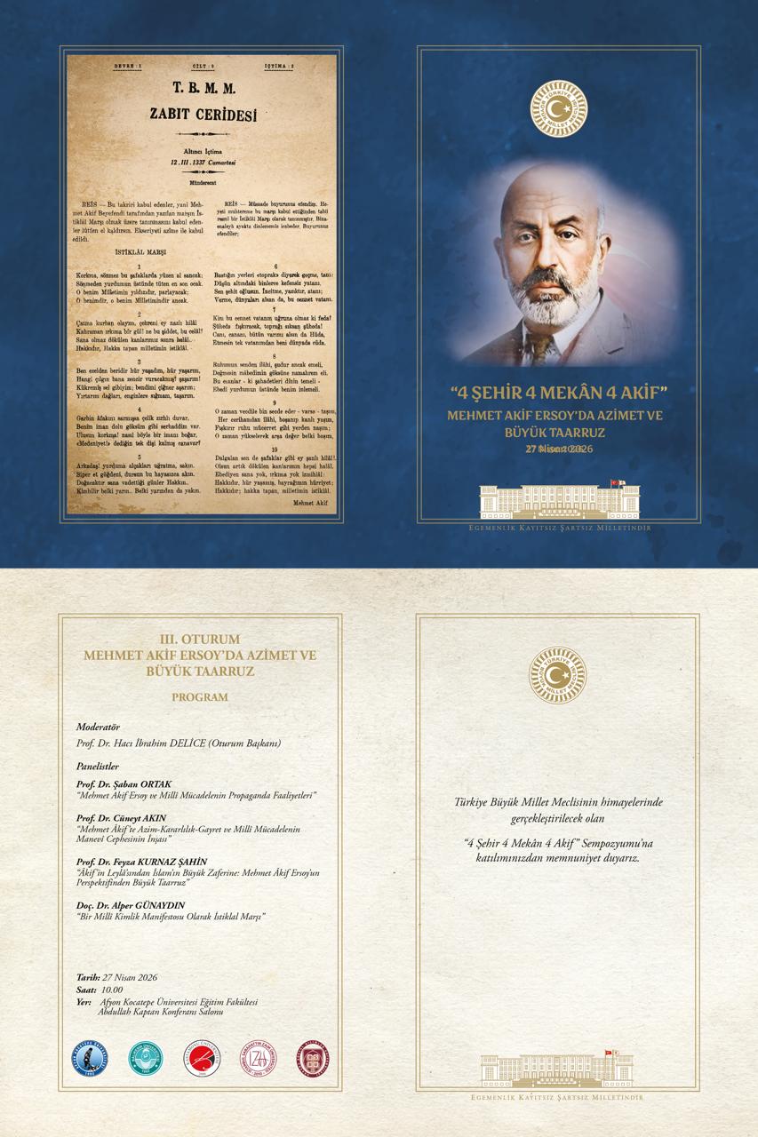 Türkiye Büyük Millet Meclisi (TBMM) himayesinde Afyon Kocatepe Üniversitesi (AKÜ), Ankara Sosyal Bilimler Üniversitesi, Balıkesir Üniversitesi, İstanbul Sabahattin Zaim Üniversitesi ve Kastamonu Üniversitesi iş birliğiyle düzenlenen “4 Şehir, 4 Mekân, 4 Âkif: Esaretten İstiklale, İstiklalden İstikbale Mehmet Akif Sempozyumu” kapsamındaki “Mehmet Akif Ersoy’da Azimet ve Büyük Taarruz” oturumu, AKÜ ev sahipliğinde 27 Nisan 2026 Pazartesi günü saat 10.00’da Eğitim Fakültesi Abdullah Kaptan Konferans Salonunda  gerçekleştirilecek.