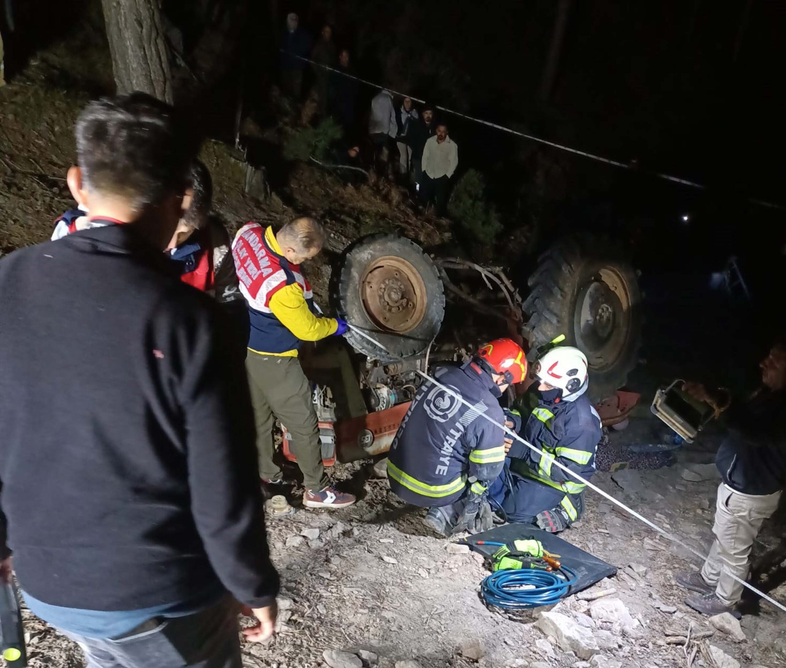 Mahalle sakinleri, sabah saatlerinde arama çalışmalarını sürdürürken ormanlık alanda devrilen traktörü buldu. Hemen sağlık, jandarma ve itfaiye ekiplerine haber verildi.