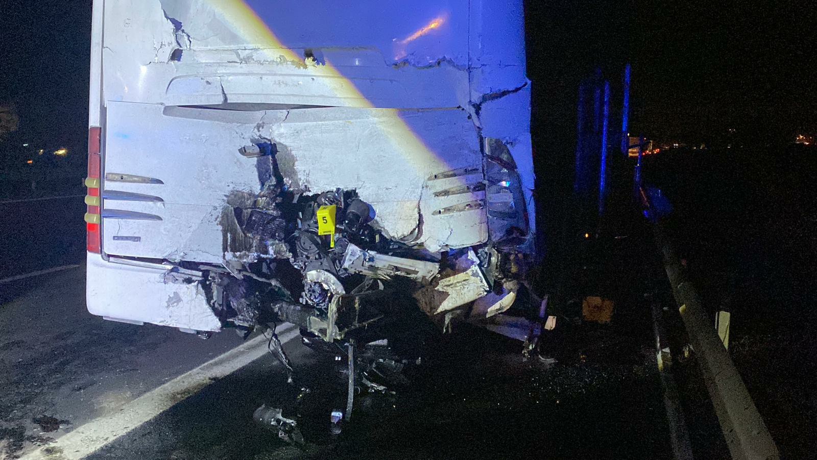 Aynı yönde seyreden Hayrettin K. yönetimindeki TIR, sürücüsünün dikkatsizliği sonucu park halindeki otobüse arkadan çarptı. Çarpmanın etkisiyle otobüsteki 13 yolcu yaralandı. TIR sürücüsü ise kabinde sıkışarak ağır yaralandı.