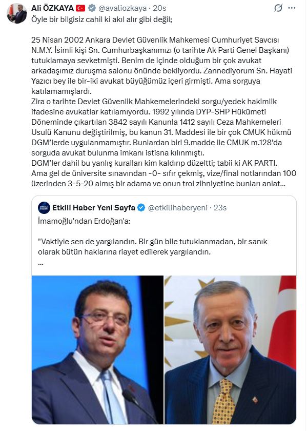 Açıklamasında İmamoğlu’nun akademik geçmişine ve sınav notlarına dair iddialarda da bulunan Ali Özkaya, “Üniversite sınavından sıfır çekmiş, vize notlarından 3-5 almış bir adama bunları anlat” ifadelerini kullanarak tartışmayı farklı bir boyuta taşıdı. Bu polemik, geçmişteki yargı pratikleri ve güncel hukuk tartışmaları üzerinden sosyal medyada geniş yankı buldu.>>>HABER MERKEZİ