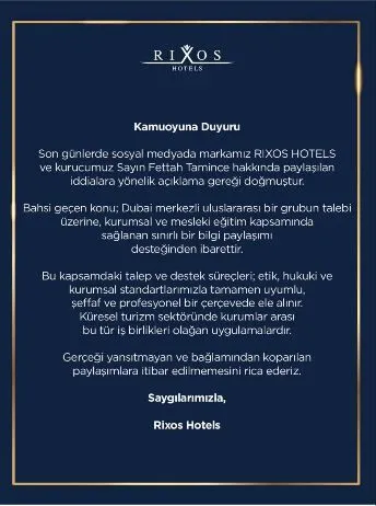 “Son günlerde sosyal medyada markamız RIXOS HOTELS ve kurucumuz Sayın Fettah Tamince hakkında paylaşılan iddialara yönelik açıklama gereği doğmuştur. Bahsi geçen konu; Dubai merkezli uluslararası bir grubun talebi üzerine, kurumsal ve mesleki eğitim kapsamında sağlanan sınırlı bir bilgi paylaşımı desteğinden ibarettir. Bu kapsamdaki talep ve destek süreçleri; etik, hukuki ve kurumsal standartlarımızla tamamen uyumlu, şeffaf ve profesyonel bir çerçevede ele alınır. Küresel turizm sektöründe kurumlar arası bu tür iş birlikleri olağan uygulamalardır. Gerçeği yansıtmayan ve bağlamından koparılan paylaşımlara itibar edilmemesini rica ederiz.”
