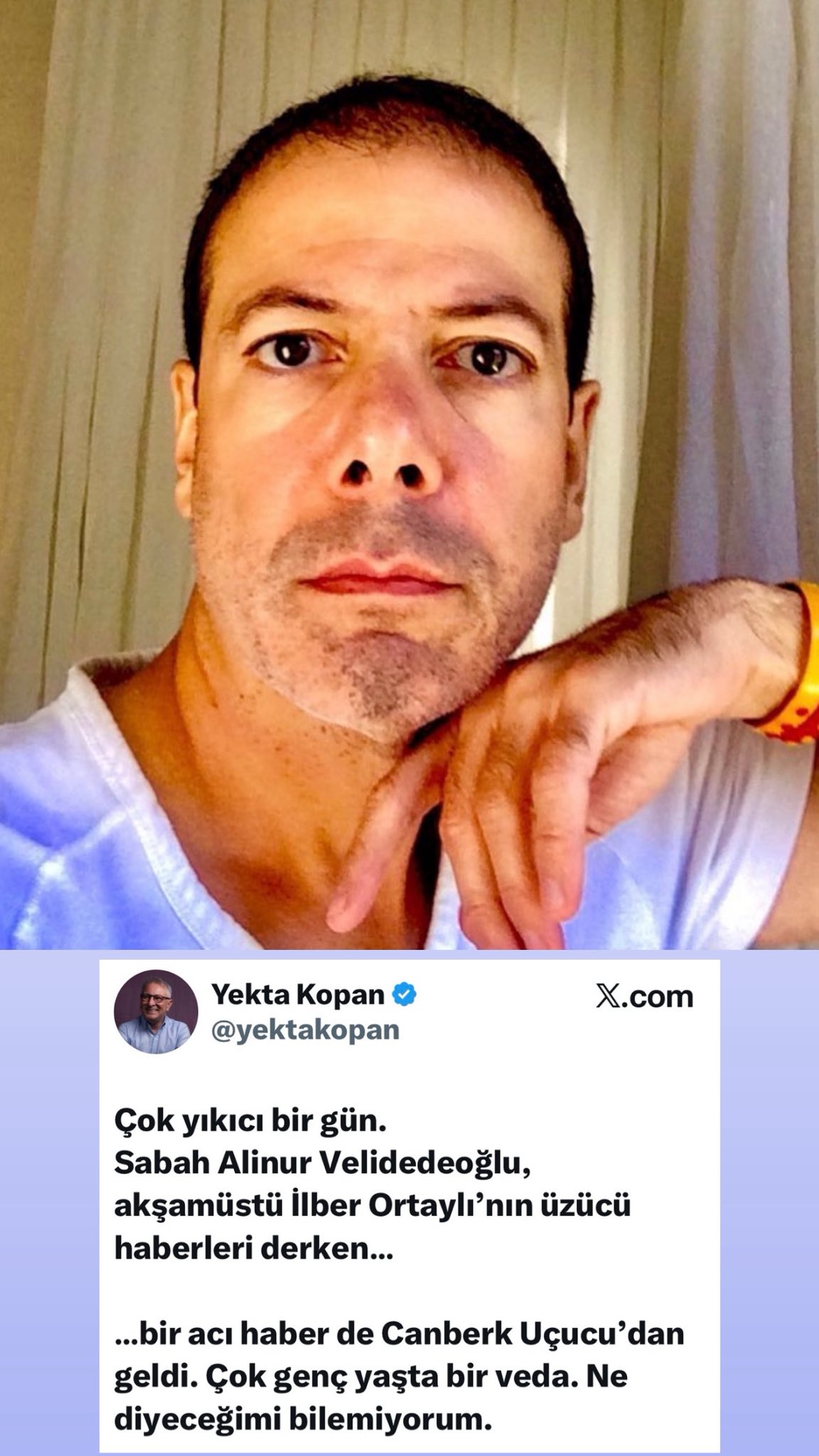 Seslendirme sanatçısı ve yazar Yekta Kopan, sosyal medya hesabından yaptığı paylaşımla yakın dostunun vefatını duyurdu. Kopan, bugün sanat dünyasından gelen diğer acı haberlere de değinerek, “Çok yıkıcı bir gün. Sabah Alinur Velidedeoğlu, akşamüstü İlber Ortaylı’nın üzücü haberlerinin ardından bir acı haber de Canberk Uçucu’dan geldi. Çok genç yaşta bir veda… Ne diyeceğimi bilemiyorum” ifadelerini kullandı.