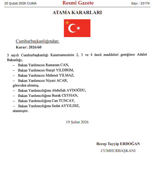 Cumhurbaşkanlığı’nın 2026/60 sayılı kararı kapsamında Adalet Bakanlığı’nda görev yapan dört bakan yardımcısı görevden alındı. Kararla birlikte Ramazan Can, Hurşit Yıldırım, Mehmet Yılmaz ve Niyazi Acar görevlerinden ayrıldı.