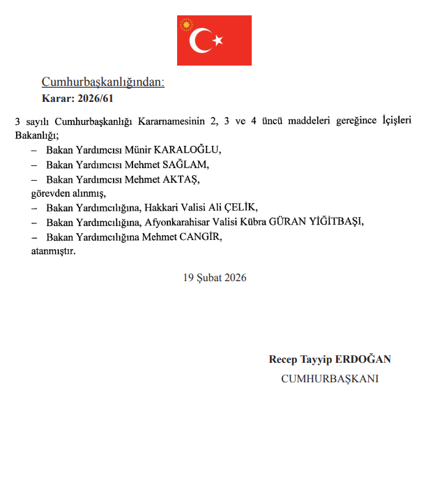 Cumhurbaşkanlığı’nın 2026/61 sayılı kararı ile İçişleri Bakanlığı’nda da önemli görev değişiklikleri yapıldı. Karar kapsamında Münir Karaloğlu, Mehmet Sağlam ve Mehmet Aktaş bakan yardımcılığı görevlerinden alındı.