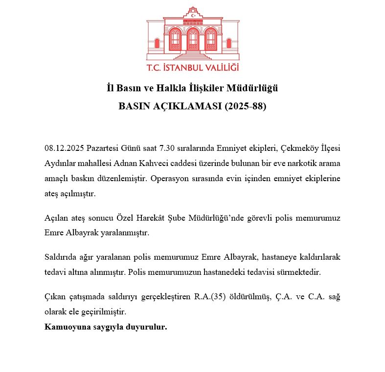 İl Valiliği tarafından yapılan açıklamada, olayın 08 Aralık 2025 Pazartesi Günü saat 7.30 sıralarında gerçekleştiği teyit edildi. Açıklamada, narkotik arama baskını sırasında ekiplere evin içinden ateş açıldığı, açılan ateş sonucu polis memuru Emre Albayrak’ın ağır yaralandığı belirtildi.