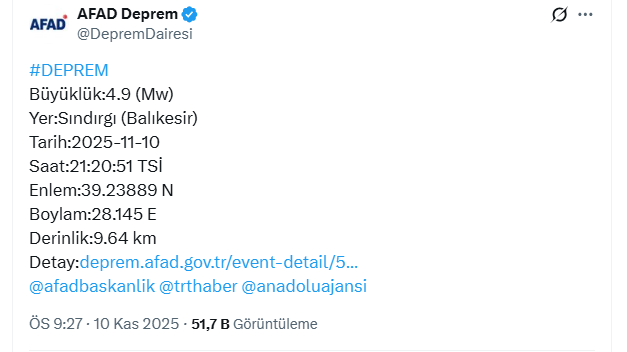 AFAD’ın paylaştığı verilere göre, Balıkesir Sındırgı’da 9 kilometre derinlikte 4,9 büyüklüğünde deprem oldu.