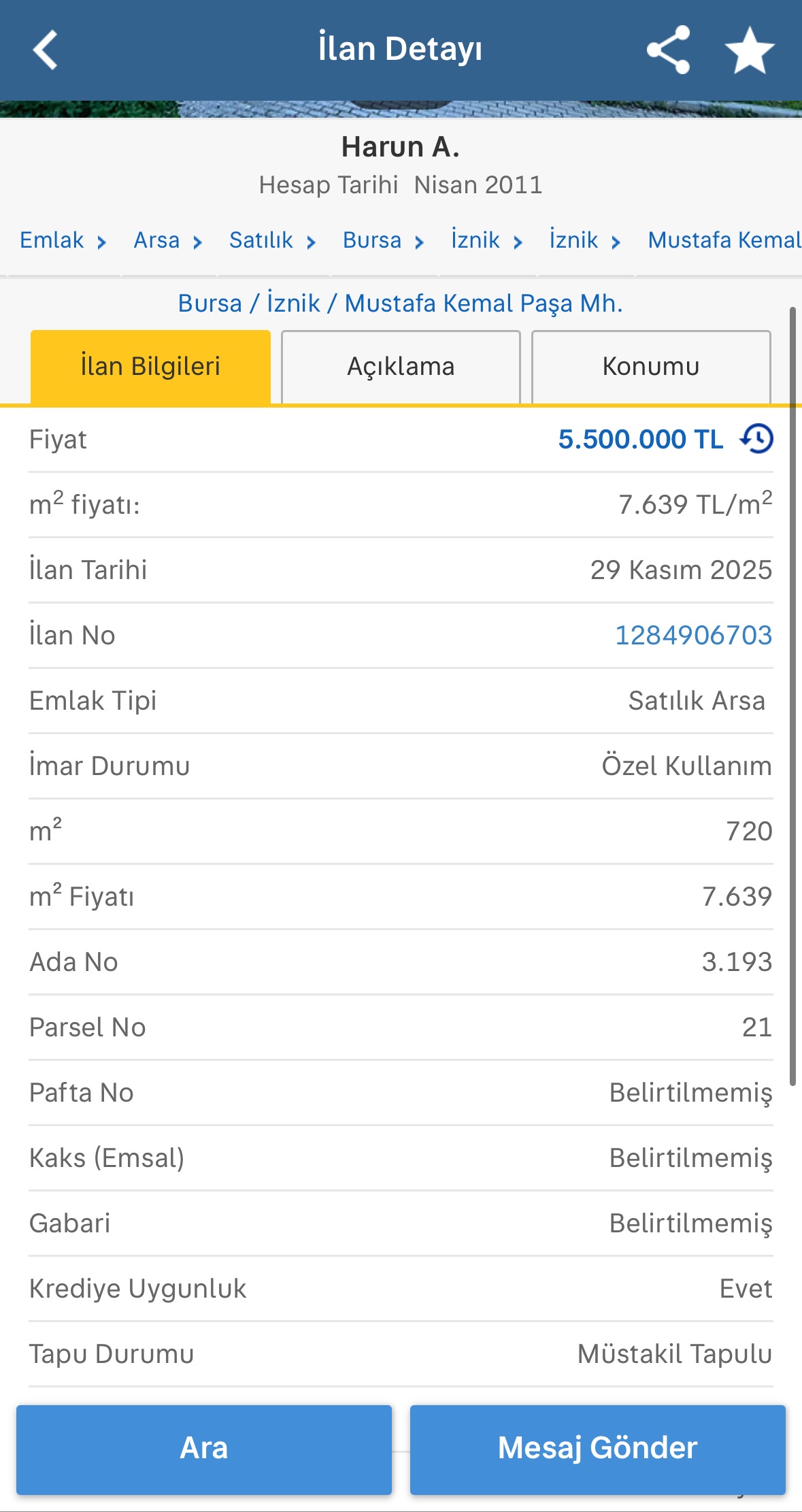 İznik’te yer alan ve birinci derece sit alanı içinde bulunan 720 metrekarelik arsa, Katoliklerin ruhani lideri Papa 14’üncü Leo’nun ziyaretinden bir gün sonra satışa sunuldu. Arsayı, 13 yıl önce ailesiyle satın alan inşaat mühendisi Kadircan Aslıvar, arsanın sur içindeki özel konumuna dikkat çekti.
