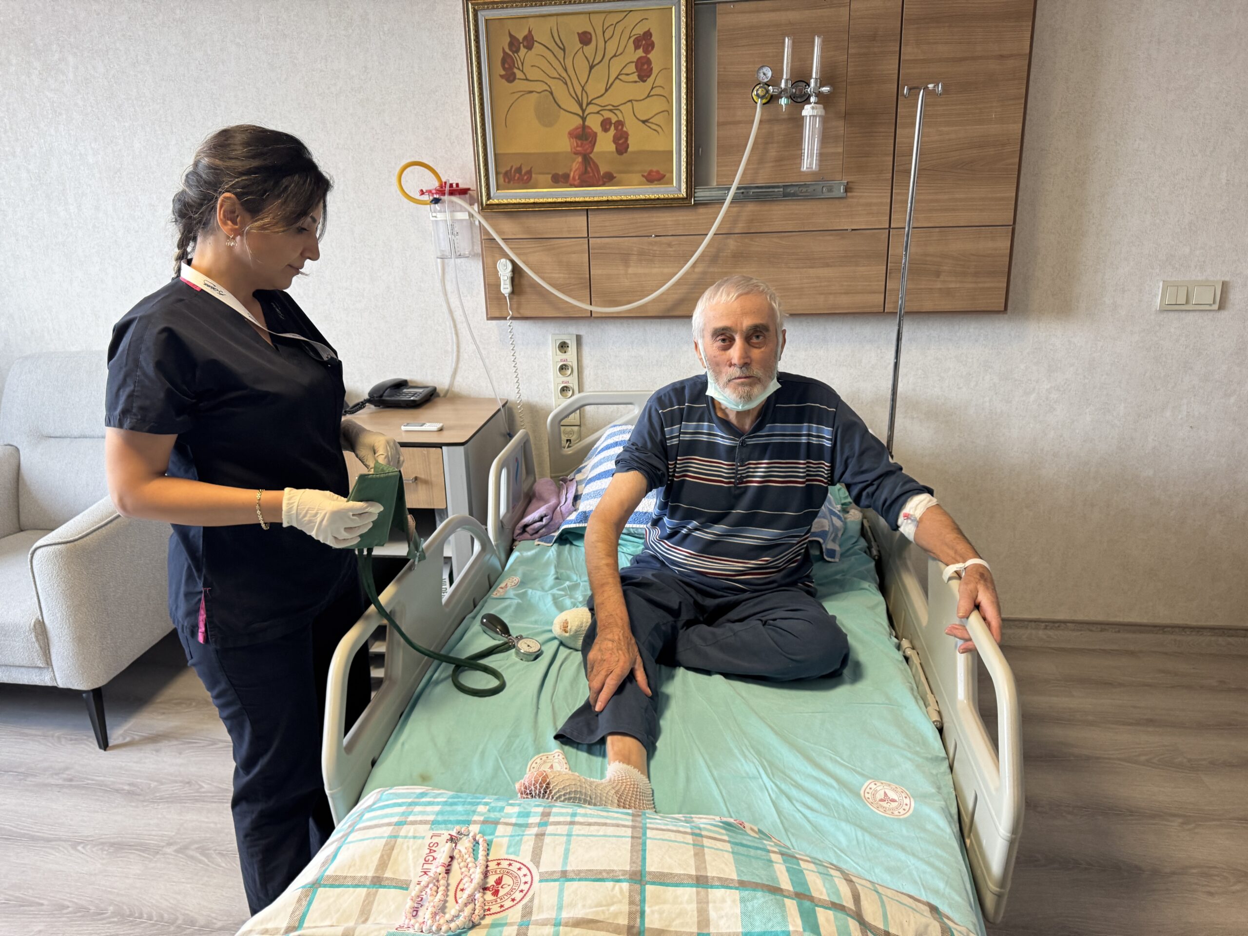 Uşak Dikilitaş Mahallesi’nde yaşayan ve 20 yıldır şeker hastalığıyla mücadele eden Mehmet Yıldırım’ın ayaklarında, 2022 yılında damar tıkanıklığı başladı. Yaklaşık 3 ay önce de parmaklarında çürüme görülen ve bir süre hastanede tedavi gören Yıldırım, daha sonra Afyonkarahisar Devlet Hastanesi Diyabetik Ayak ve Yara Bakım Ünitesine başvurdu. Şeker hastası olduğu için ayağının kesilme ihtimali bulunan Yıldırım’ın, doktorların iki başarılı cerrahi müdahalesiyle sağ ayağındaki çürüyen iki parmağı alındı. Yaklaşık 1,5 ay süren tedavisi sonucunda ayağı kurtarılan Yıldırım, önümüzdeki günlerde taburcu olmaya hazırlanıyor.