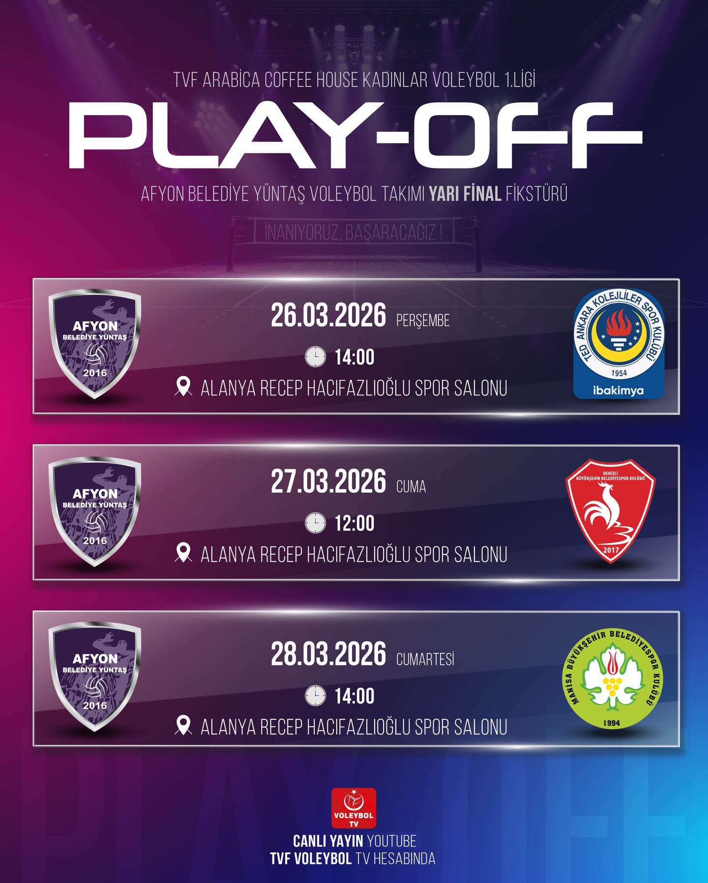 26 Mart Perşembe günü Ted Ankara Kolejliler ile, 27 Mart Cuma günü Denizli BBSK ile ve 28 Mart Cumartesi günü Manisa BBSK ile karşı karşıya gelecek. Afyon temsilcisi, play-off mücadelelerinde taraftarlarının desteğiyle başarılı bir performans sergilemeyi hedefliyor.