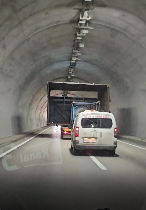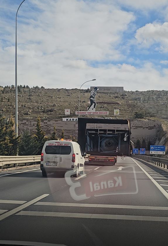 Özellikle Karahisar Tüneli’ne giriş anı ise tam anlamıyla nefesleri tuttu. Dev yükle tünele yaklaşan çekici, adeta milimetrik bir hesapla yolun tam ortasından ilerleyerek içeri girdi. O anları görüntüleyen bir gazetecinin, esprili anonsu gülümsetti.
