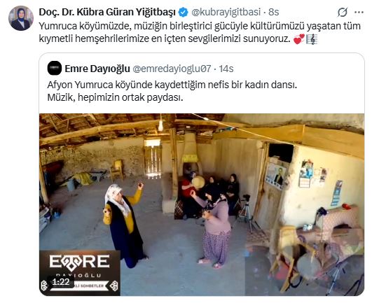 Görüntüleri alıntılayarak takipçileriyle paylaşan Vali Kübra Güran Yiğitbaşı, kültürel değerlerin korunmasının önemine dikkat çekti. Yiğitbaşı, “Yumruca köyümüzde, müziğin birleştirici gücüyle kültürümüzü yaşatan tüm kıymetli hemşehrilerimize en içten sevgilerimizi sunuyoruz” ifadelerini kullanarak, geleneklerini yaşatan köy halkına teşekkür etti.