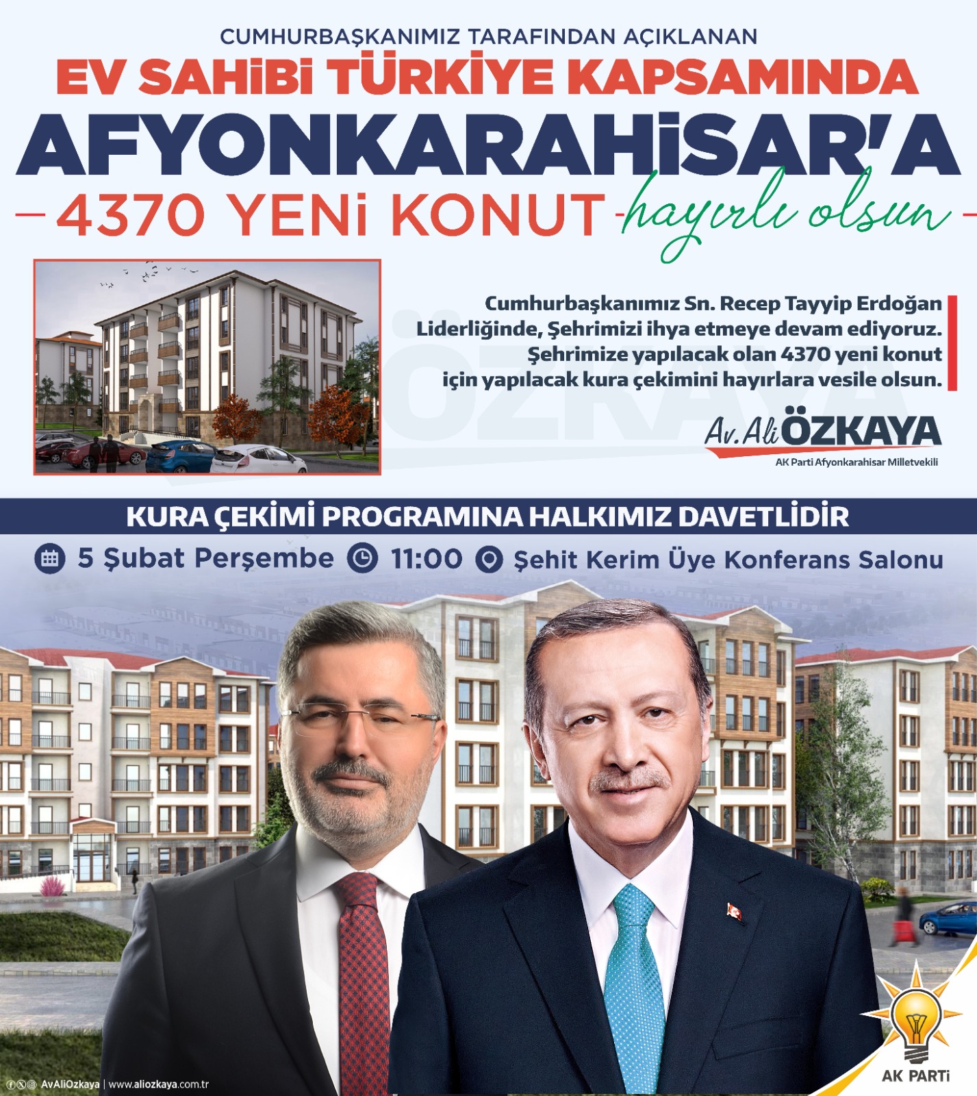 Milletvekili Özkaya, Cumhurbaşkanı Recep Tayyip Erdoğan’ın vizyonuyla AK Parti iktidarı öncesinde adı dahi bilinmeyen TOKİ aracılığıyla Türkiye genelinde büyük bir konut seferberliği başlatıldığını belirterek, “Bu kapsamda şehrimizde de muazzam bir konut hamlesi gerçekleştirilmiştir. Bugüne kadar yaklaşık 15 bin konutu Afyonkarahisar’ımıza kazandırmanın mutluluğunu yaşıyoruz. Artık beldelerimize kadar konut yapılabilir bir noktaya gelmiş bulunuyoruz” dedi. Cumhurbaşkanı Erdoğan tarafından ilan edilen Ev Sahibi Türkiye Projesi kapsamında Afyonkarahisar’da 4.370 yeni konutun inşa edileceğini ifade eden Özkaya, TOKİ aracılığıyla vatandaşların uygun koşullarla ev sahibi olmaya devam edeceğini söyledi. Özkaya, il merkezi, ilçeler ve beldelerde yapılacak konutlar için başvuru yapan vatandaşlar adına 5 Şubat tarihinde Kamil Miras-Şehit Kerim Üye Konferans Salonu’nda kura çekimi yapılacağını, böylelikle hak sahiplerinin belirleneceğini kaydetti. TOKİ konutlarına yoğun ilgi olduğunu vurgulayan Milletvekili Özkaya, “Afyonkarahisar’da yaklaşık 25 bin başvuru gerçekleşti. Bu başvuruların yaklaşık 1.500’ü şartları taşımadığı için kuraya katılamayacak. Başvuruların dağılımına baktığımızda ise; Gençlerimizden yaklaşık 7.500 başvuru, emeklilerimizden yaklaşık 4.200 başvuru, engelli vatandaşlarımızdan yaklaşık 1.100 başvuru, şehit yakını ve gazilerimizden yaklaşık 150 başvuru olduğunu görmekteyiz. Bu tablo, milletimizin Cumhurbaşkanımıza ve AK Parti’mize olan güveninin en somut göstergesidir” dedi. Konutların hızlı bir şekilde tamamlanacağını ifade eden Özkaya, “İnşallah vatandaşlarımızı en kısa sürede yeni yuvalarına kavuşturacağız. Bu büyük projenin şehrimize ve ülkemize hayırlı olmasını temenni ediyor; başta Cumhurbaşkanımız Sn. Recep Tayyip Erdoğan olmak üzere, Çevre, Şehircilik ve İklim Değişikliği Bakanımız Sn. Murat Kurum’a, TOKİ Başkanlığımıza ve emeği geçen herkese teşekkür ediyorum,” ifadelerini kullandı. >>>Haber Merkezi