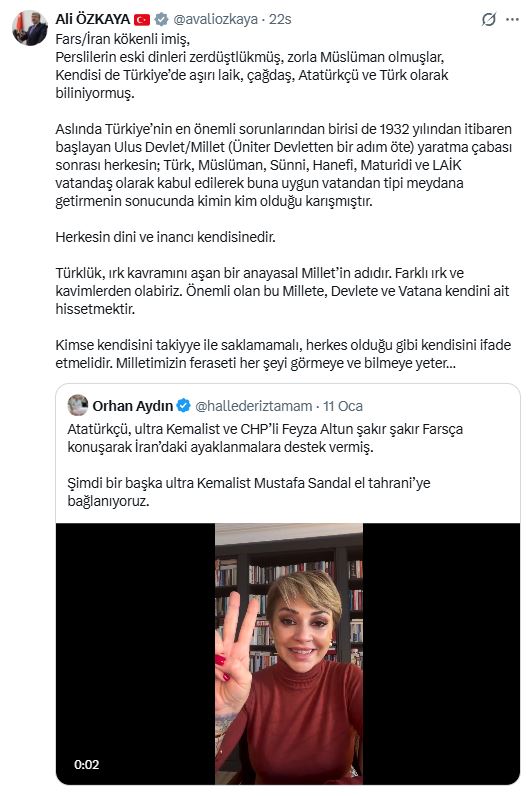 Ali Özkaya: ”Fars/İran kökenli imiş, Perslilerin eski dinleri zerdüştlükmüş, zorla Müslüman olmuşlar, Kendisi de Türkiye’de aşırı laik, çağdaş, Atatürkçü ve Türk olarak biliniyormuş. Aslında Türkiye’nin en önemli sorunlarından birisi de 1932 yılından itibaren başlayan Ulus Devlet/Millet (Üniter Devletten bir adım öte) yaratma çabası sonrası herkesin; Türk, Müslüman, Sünni, Hanefi, Maturidi ve LAİK vatandaş olarak kabul edilerek buna uygun vatandan tipi meydana getirmenin sonucunda kimin kim olduğu karışmıştır. Herkesin dini ve inancı kendisinedir. Türklük, ırk kavramını aşan bir anayasal Millet’in adıdır. Farklı ırk ve kavimlerden olabiriz. Önemli olan bu Millete, Devlete ve Vatana kendini ait hissetmektir. Kimse kendisini takiyye ile saklamamalı, herkes olduğu gibi kendisini ifade etmelidir. Milletimizin feraseti her şeyi görmeye ve bilmeye yeter… ”ifadelerini kullandı.