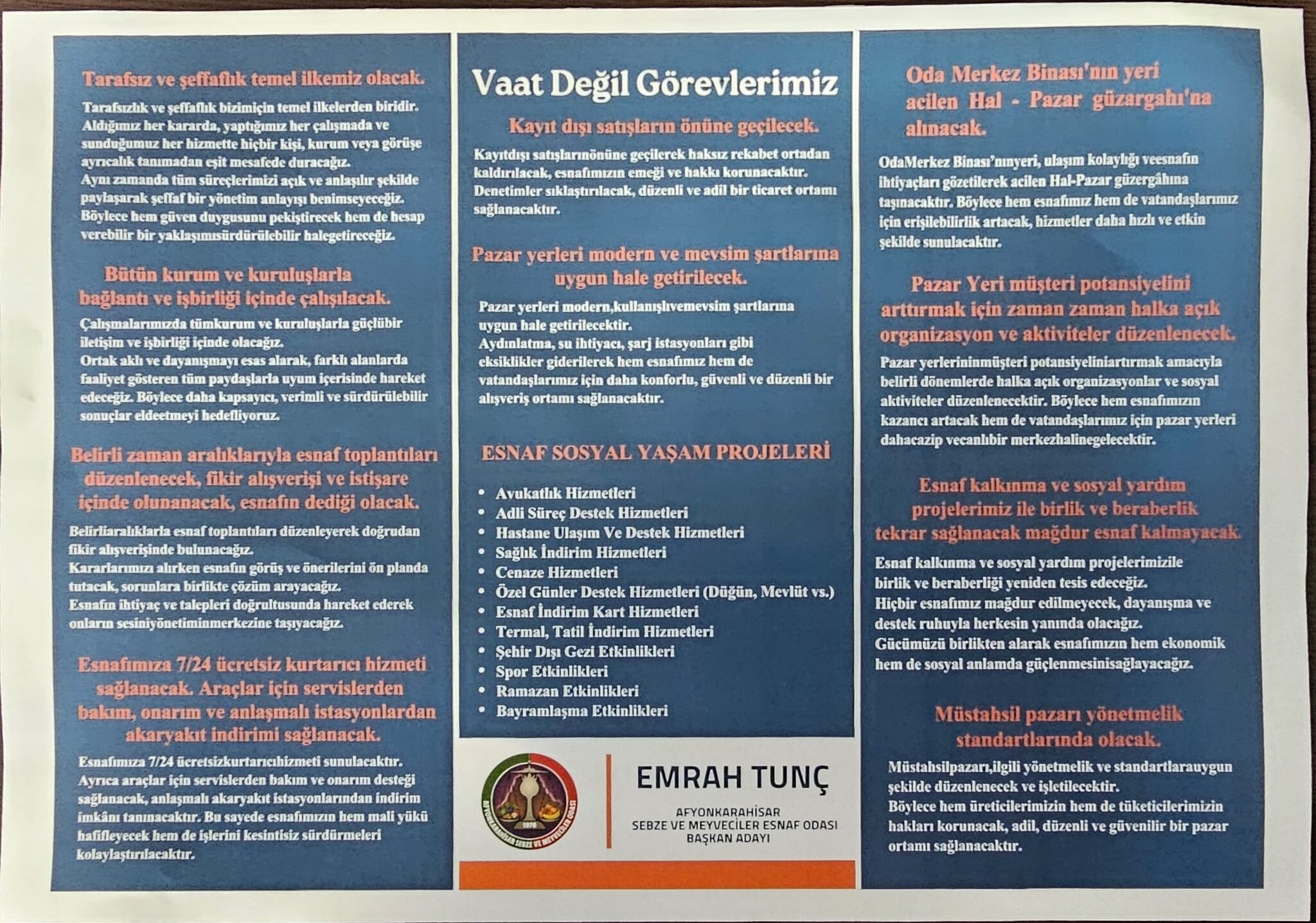 Sosyal ve ekonomik projelere de değinen Tunç, Esnaf Kooperatifi kurma hedeflerini şu sözlerle anlattı: “Sadece pazarcılar değil; manavı, tuhafiyecisi, peynircisi… Afyon’un en uç noktalarında esnafımız var. Hepsini tek çatı altında toplayacak, dayanışmayı artıracak bir yapı kurmak istiyoruz.”