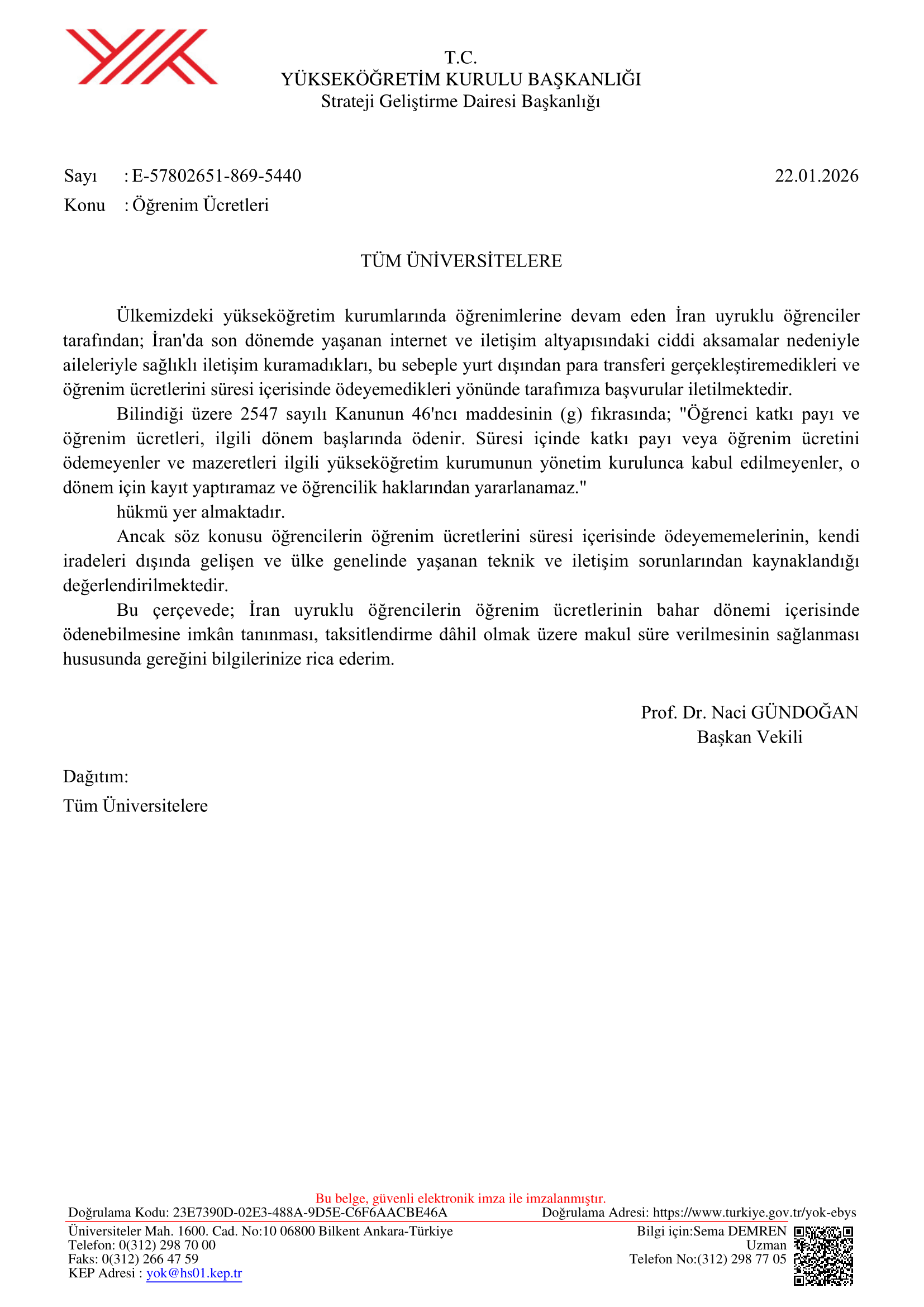 YÖK tarafından yükseköğretim kurumlarına gönderilen yazıda, İran genelinde yaşanan iletişim kesintileri ve para transferi sorunlarının öğrencilerin kontrolü dışında geliştiği belirtildi. Bu nedenle çok sayıda öğrencinin ve ailesinin öğrenim ücretlerini süresi içinde Türkiye’ye gönderemediği, konuyla ilgili YÖK’e yoğun başvurular ulaştığı ifade edildi. Resmî yazıda, 2547 sayılı Yükseköğretim Kanunu’nun öğrenim ücretlerine ilişkin hükümleri hatırlatılırken, mevcut durumun olağan koşullardan farklı olduğuna dikkat çekildi. Yaşanan sorunların bireysel bir ihmalden değil, ülke çapındaki teknik ve finansal aksaklıklardan kaynaklandığı vurgulandı. Bu kapsamda YÖK, üniversitelerden İran uyruklu öğrencilerin bahar dönemi içerisinde öğrenim ücretlerini ödeyebilmelerine olanak tanımalarını istedi. Gerekli görülmesi halinde taksitlendirme yapılması ve öğrencilere makul bir süre verilmesi yönünde anlayış gösterilmesi talep edildi. Yükseköğretim Kurulu Başkan Vekili Prof. Dr. Naci Gündoğan imzasıyla gönderilen yazının, Türkiye’de eğitim gören İranlı öğrencilerin akademik haklarının korunması ve olası mağduriyetlerin önüne geçilmesi amacı taşıdığı değerlendiriliyor. >>>Haber Merkezi