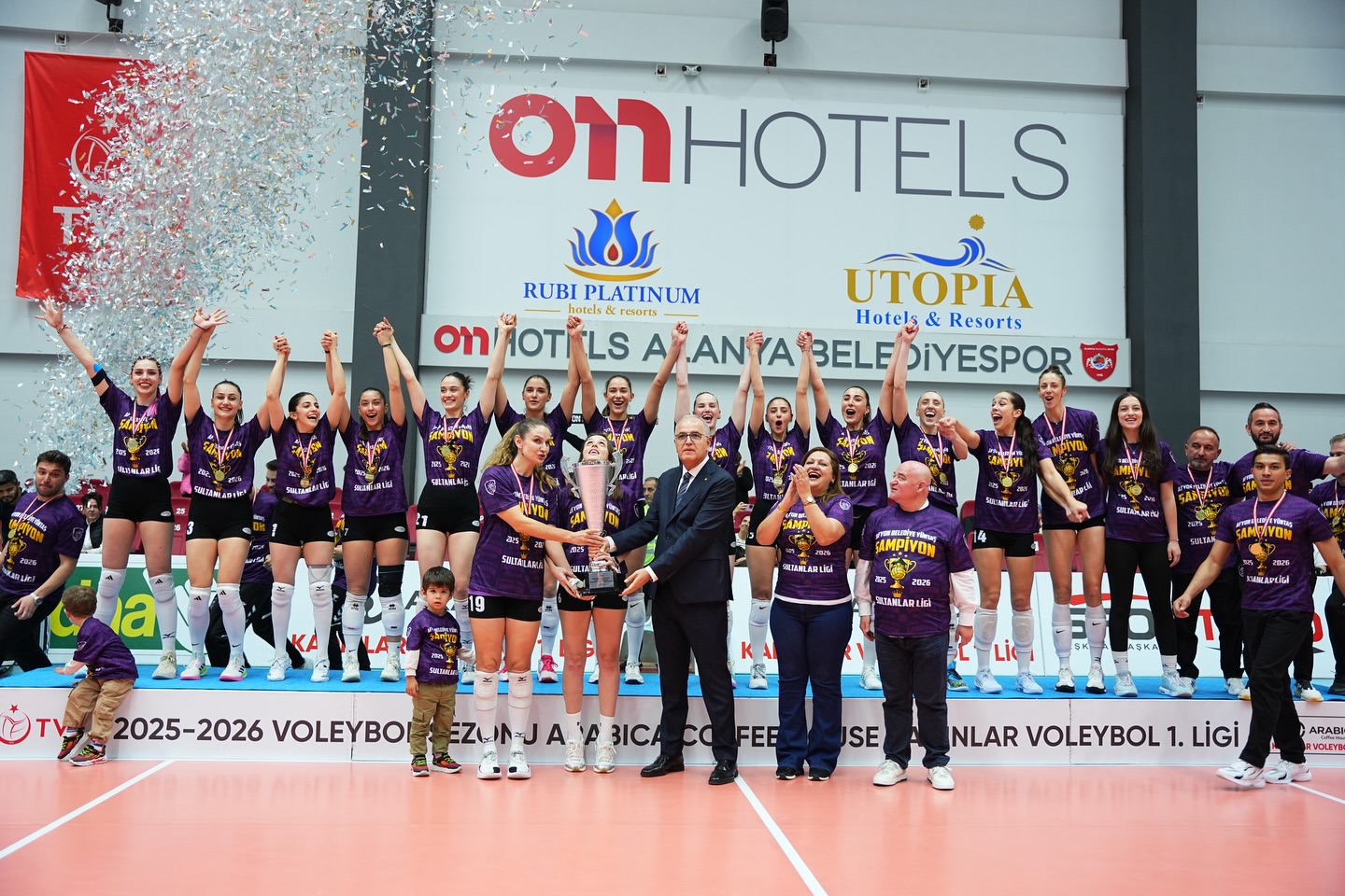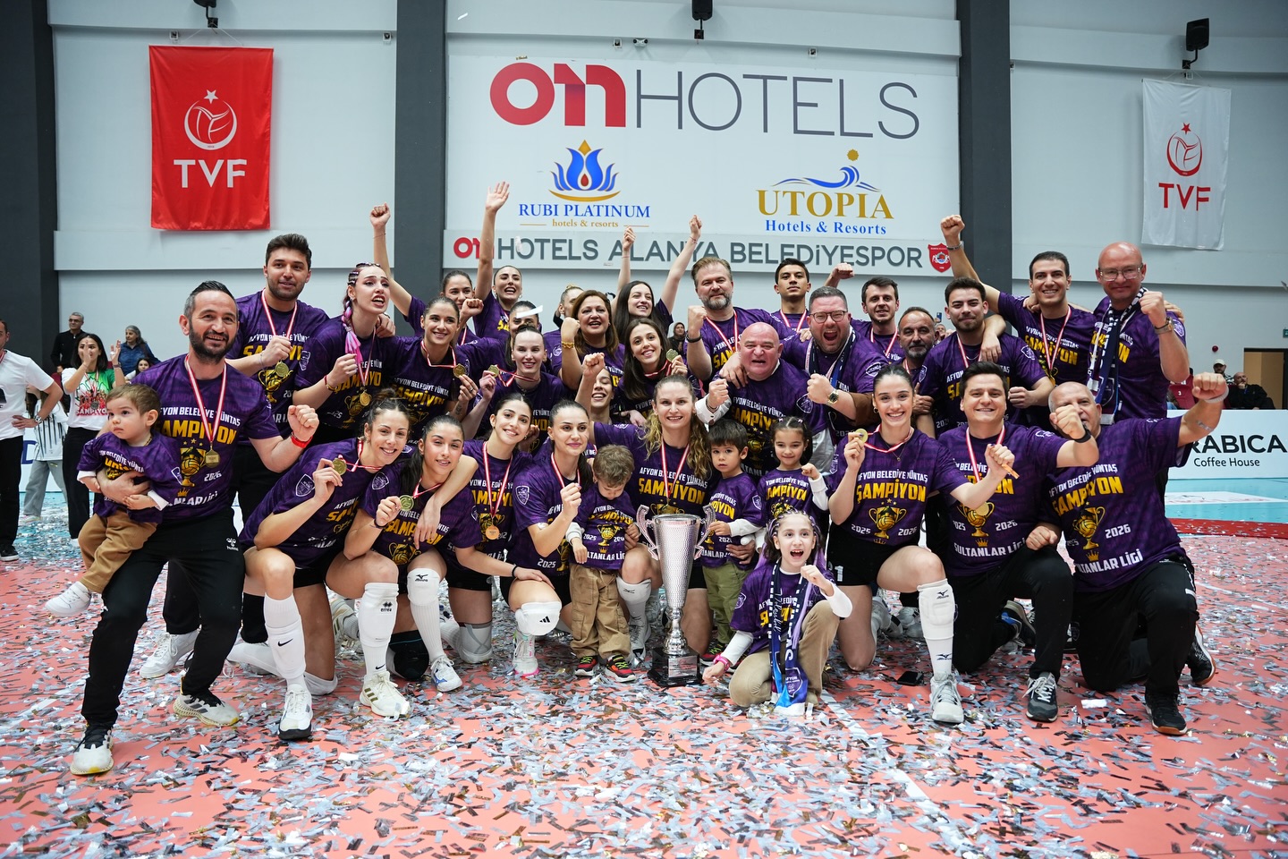 Arabica Coffee House Kadınlar 1. Lig’de lig etabını ikinci, final etabını ise şampiyon tamamlayarak Sultanlar Ligi’ne yükselen Afyon Belediye Yüntaş voleybol takımı, düzenlenen kupa töreninde şampiyonluk kupasını aldı.