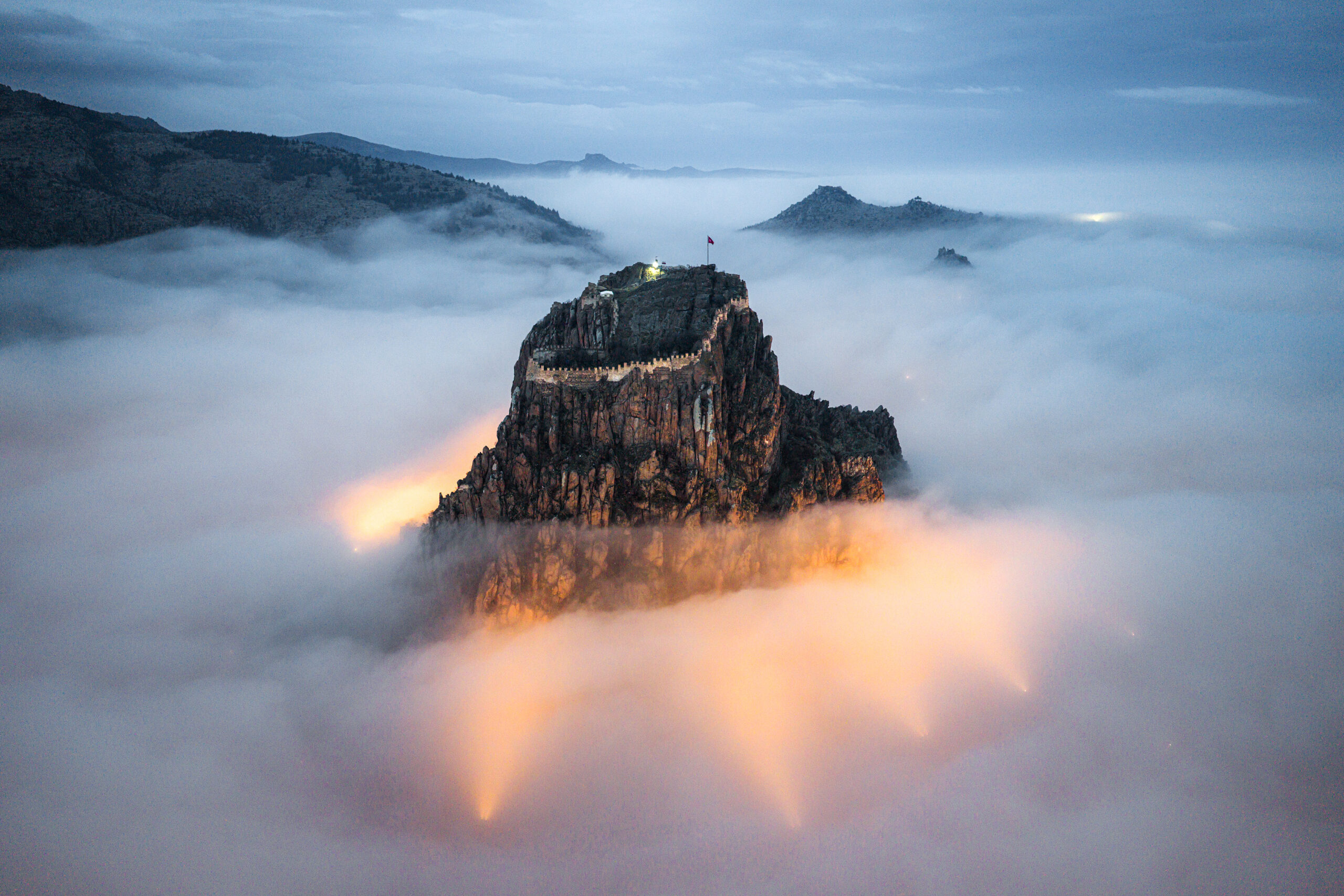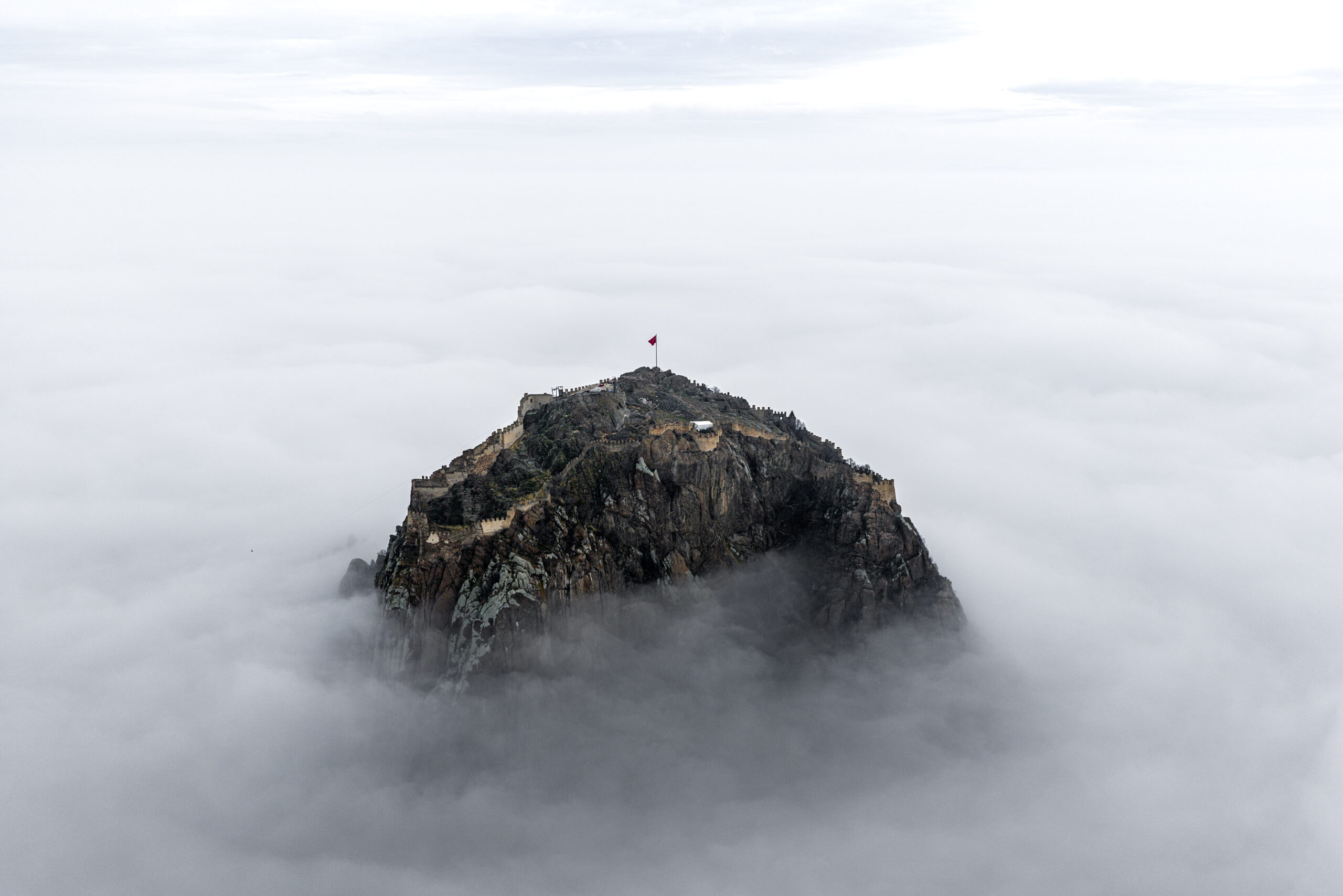 Afyonkarahisar’ın simgesi olan tarihi Afyonkarahisar Kalesi, sabahın erken saatlerinde kenti etkisi altına alan yoğun sisle birlikte adeta kartpostallık bir manzaraya büründü. Yüzyıllardır şehrin üzerinde dimdik duran kale, sis bulutlarının arasından yükselerek izleyenlere görsel bir şölen sundu.