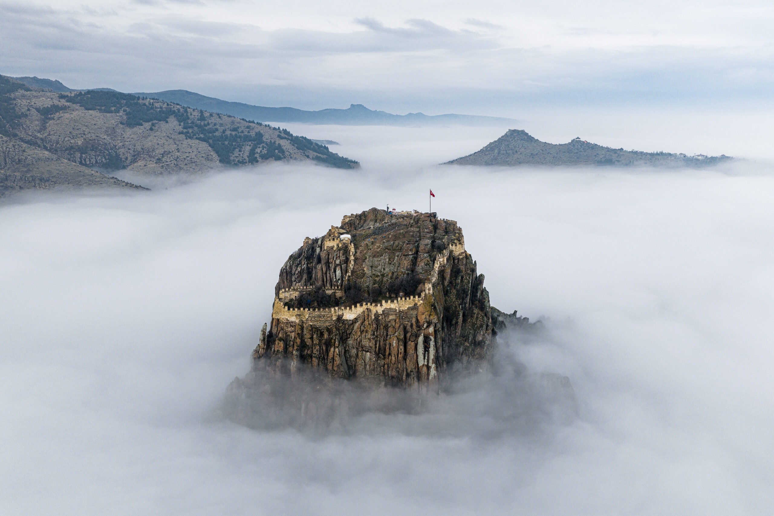 Afyonkarahisar’da kentin simgelerinden biri olan Afyonkarahisar Kalesi, sabahın erken saatlerinde oluşan sis ile görüntülendi. ( Seyit Konyalı – Anadolu Ajansı )