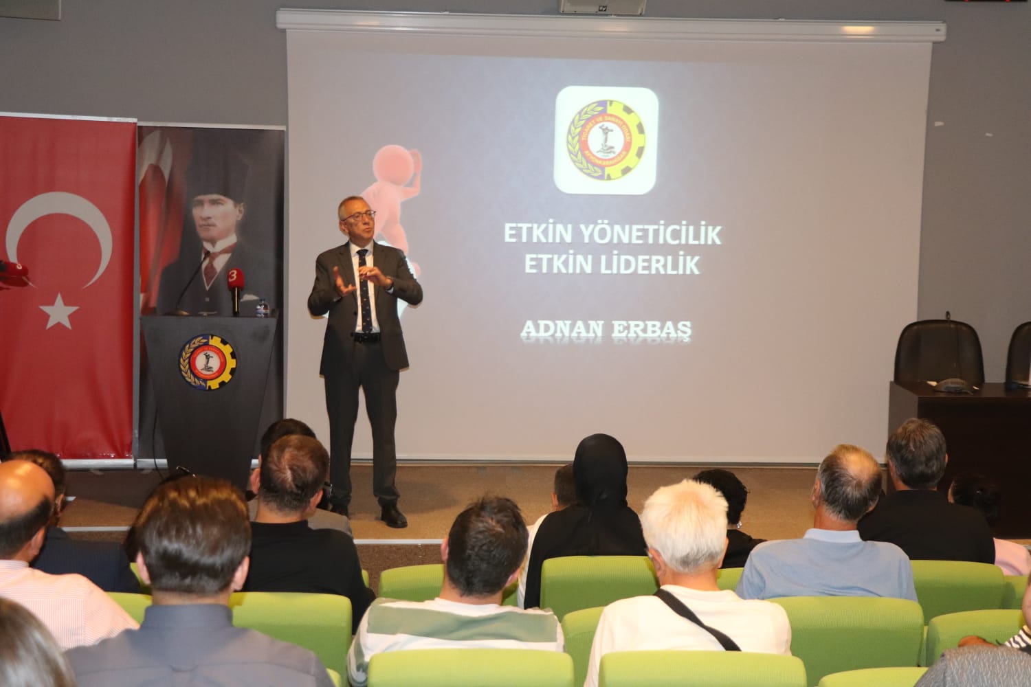 Eğitim öncesinde, Yönetim Kurulu Üyemiz İbrahim Sömer açılış konuşmasını yaparak katılımcıları selamladı. Sömer, “Günümüz iş dünyasında yöneticilik artık sadece görev dağıtımı yapan bir pozisyon değil; aynı zamanda insan yönetimi, stratejik düşünme, iletişim kurma ve ekip ruhunu geliştirme gibi çok yönlü beceriler gerektiren bir sorumluluktur. Bugün bizlerle birlikte olan, Devlet Tiyatrosu Sanatçısı ve aynı zamanda Davranış Bilimleri ile İletişim Uzmanı Sayın Adnan Erbaş’a, bilgi ve birikimini bizlerle paylaşacağı için şimdiden teşekkür ediyoruz. Bu eğitimi verimli geçirmeyi dileyerek sizleri tekrar saygı ve sevgi ile selamlıyorum” dedi. Katılımcılar; yöneticilerde bulunması gereken kişisel özellikler, iletişim becerileri, ilişki yönetimi, iş disiplini, çalışan motivasyonu ve etkili liderlik konularında uygulamalı örneklerle bilgilendirildi. Erbaş, etkin liderliğin sadece pozisyon değil, aynı zamanda davranış ve tutumla şekillendiğini vurguladı. Eğitim, Katılım Belgeleri’nin takdiminin ardından sona erdi. >>>Mustafa BAYER