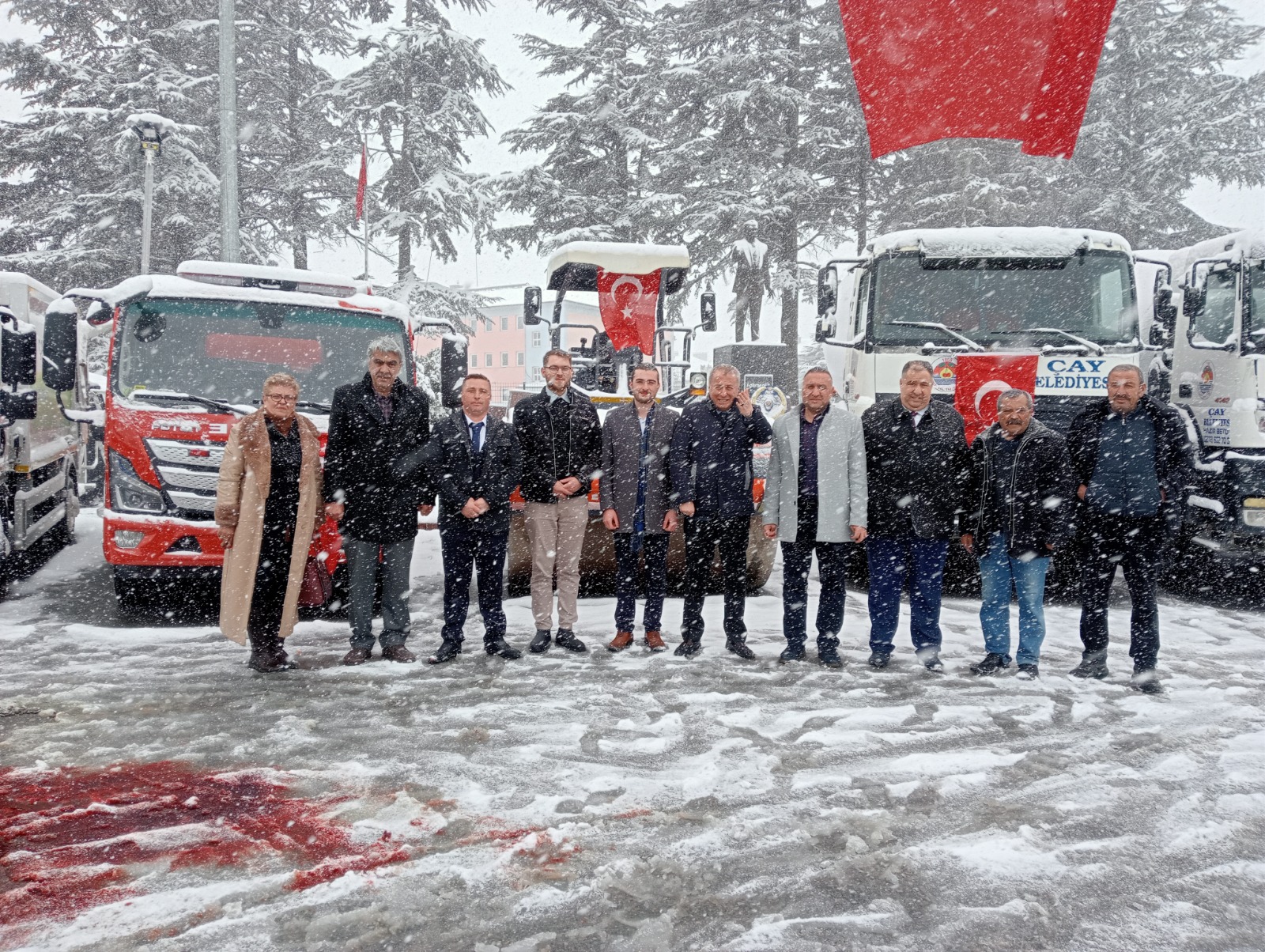 Araç filosunu genişletmeye devam eden Çay Belediyesi yeni alınan iş makinesi, itfaiye aracı ile revize edilen çöp kamyonu, beton pompası ve mikserler için tören düzenledi.