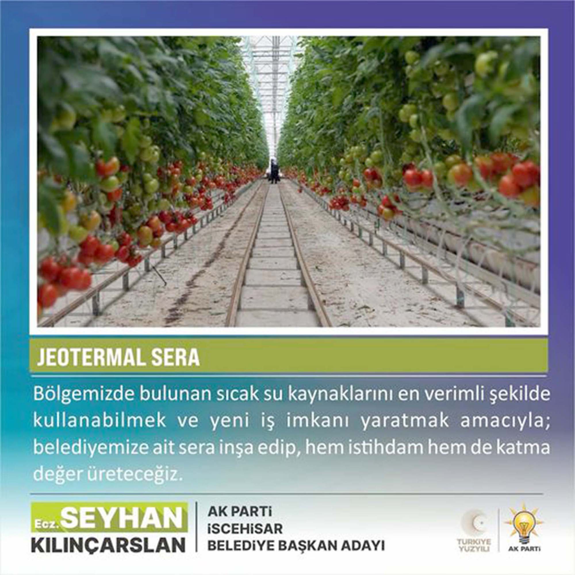 AK Parti İscehisar Belediye Başkan Adayı Seyhan Kılınçarslan bazı projelerini açıkladı. Kılınçarslan, belediyeye ait jeotermal sera inşa edeceklerini ifade ederek, “Bölgemizde bulunan sıcak su kaynaklarını en verimli şekilde kullanabilmek ve yeni iş imkanı yaratmak amacıyla belediyemize ait sera inşa edip, hem istihdam hem de katma değer üreteceğiz” dedi.
